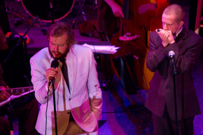 Before he was racking up kudos from Lykke Li, Lily Allen, and every music critic's year-end list, Bon Iver's Justin Vernon was a member of Eau Claire Memorial High School's jazz band. Last night the folk singer returned to his alma mater to lead present day students in new arrangements of his songs as well as standards like "Since I Fell For You" and "The Lady Is A Tramp." The local paper reports that it's the first Ensemble 1 performance to sell out. (LOL.) And the kids are gonna use last night's proceeds to attend a music competition in NYC. When my high school's most famous alumnus (Michael Crichton) returned for a visit (with Good Morning America!) it was a big deal for everyone. This looks a lot cooler.