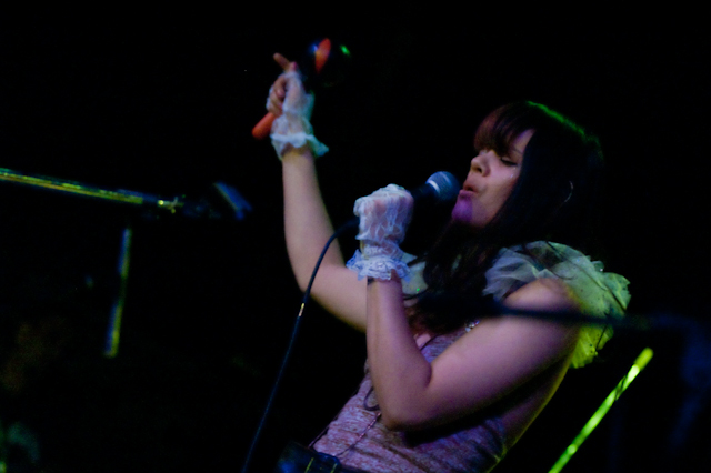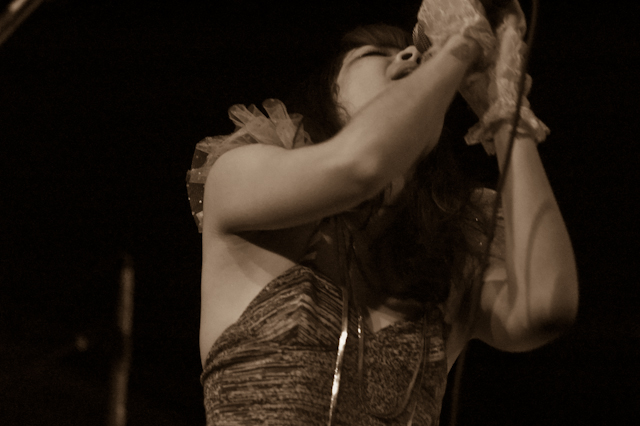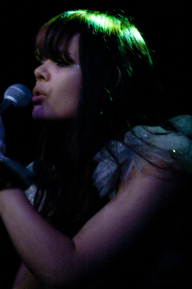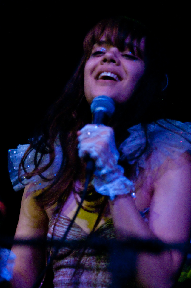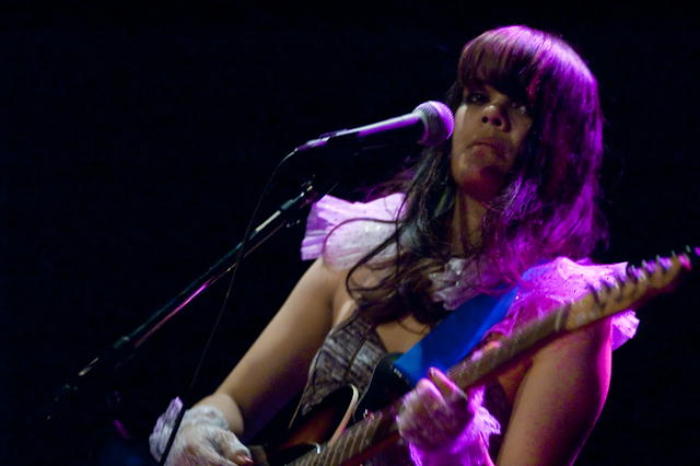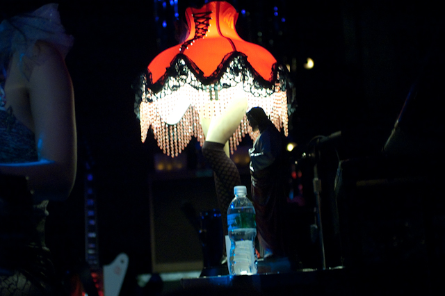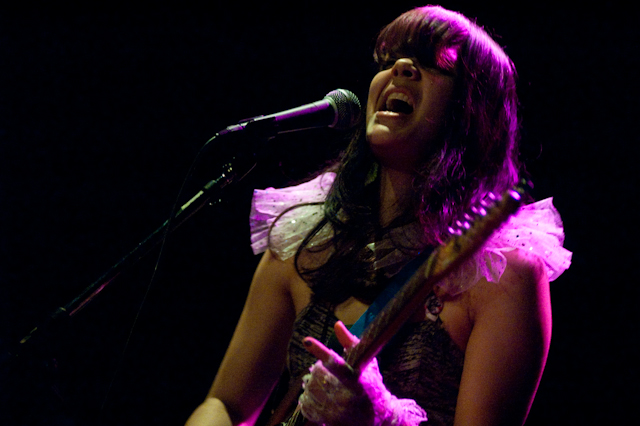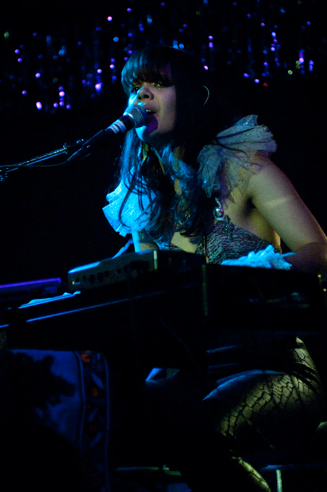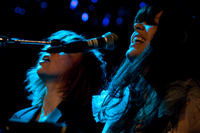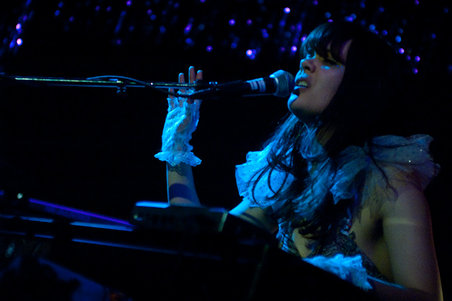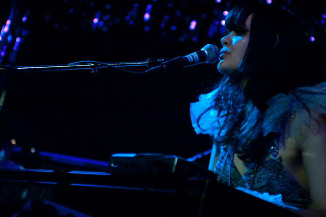 For her part Natasha came with a new band, featuring the ex-Asher Charlotte Hatherley, beats by drummer Sarah Jones, and multi-instrumental/electronics from Ben Christophers. With them, the swagger they brought even to Fur & Gold's already swaggering "Sarah" and "What's A Girl To Do," and Khan's own evolution from carefully chosen reference points to burgeoning individuality, the shift was apparent. Knitting Factory in '07 was a promise, last night was the arrival. There's still a certain chilly, art-school mysticism at play in Natasha's presentation -- there was the stage strewn with leg lamps and figurines, there were those outfits -- though it's escaped the veil of stomping rain sticks and crept toward a midnight-electro sort of mystique. She shook to her beats, belted with her guitar, poured her heart out at the piano. Her voice was resonant and unerring, the gracious shyness of her banter long gone when in song. When dancing between tunes she was bold and sexy, trailing off into demure smiles, almost like she was embarrassed, or embarrassed to know, how well it's come together. She was, in a word, perfect. This video from last night backs me up: