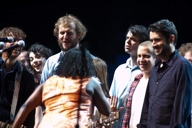 After a smoke break, Bon Iver did his thing as previously mentioned via purple prose, Feist did her thing, and Sharon Jones most definitely did her thing. No matter what you think of Sharon Jones (judging from RCMH, people think "I will go apeshit and dance to this"), this much is inarguable: you cannot follow Sharon Jones. Not with sleepy white folk, anyway. Which is precisely why she was the show closer, and also precisely why it was hilarious when the "superjam" appeared to be a sleepy tribute to the iconic folkie Pete Seeger, whose 90th was being celebrated across town at MSG. The night's performers (sans Byrne, sadly) came out and strummed "This Land Is Your Land" like it was elementary school before Sharon swaggered out and in front of them, comically scoffed, professed her "love for that version" but then instructed the Dap-Kings to show us hers. You saw how that went. That's how it ended. Good Was The Night. (Sorry. But you have to realize how many similarly terrible Was The Night puns I resisted.)