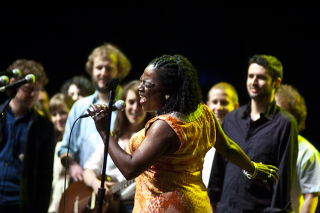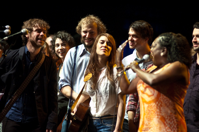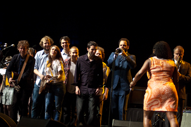 The fear with any supertalent variety show like last night's Dark Was The Night live event is that the appeal on paper will far outstrip the appeal of having your ass glued to a seat for four hours. And it was a very impressive piece of paper. But like the record that inspired it, last night's concert somehow played even better in the execution. And like the record, it seemed people were playing for keeps, along with playing for charity, knocking out unforgettable moments all night -- from seeing kindred spirits David Byrne and Dave Longstreth harmonize near the open to watching the assemblage of all-stars smile in awe as Sharon Jones hijacked and tore down the house with the closing "This Land Is Your Land" superjam. (That photo above is one of a few from that moment, in honor of Pete Seeger's 90th birthday being celebrated over at a superconcert at MSG. It started as a staid strummer, and then Sharon happened.) We've got like a 100 photos (obvs), and video of that "This Land" superjam, and exhaustive accompanying notes for your mind's eye:
