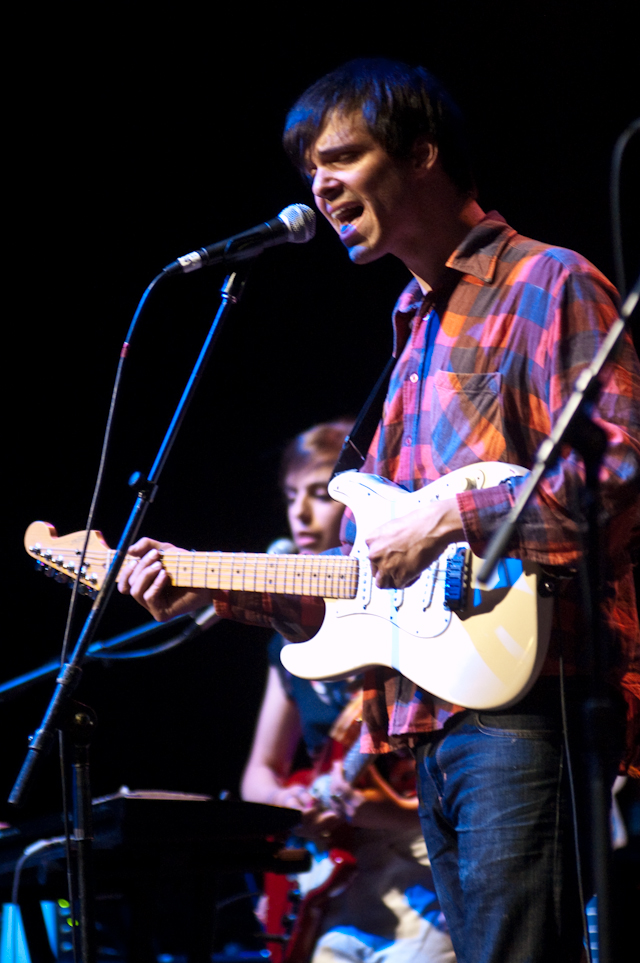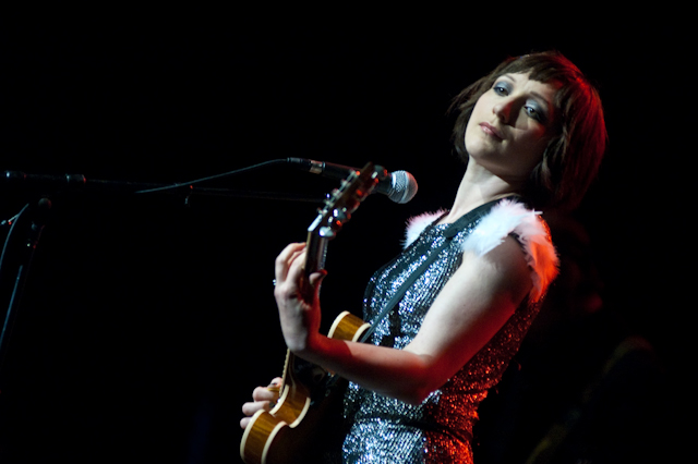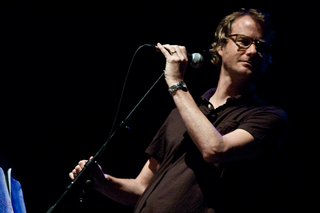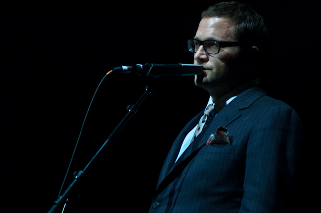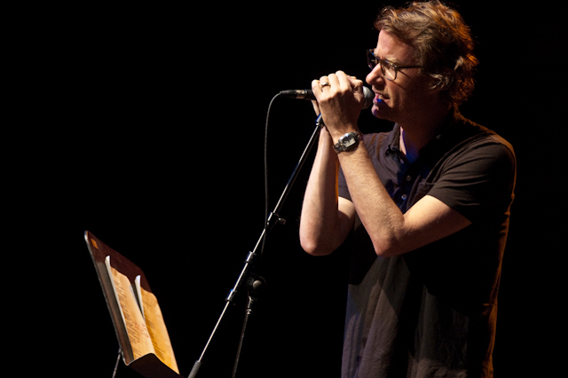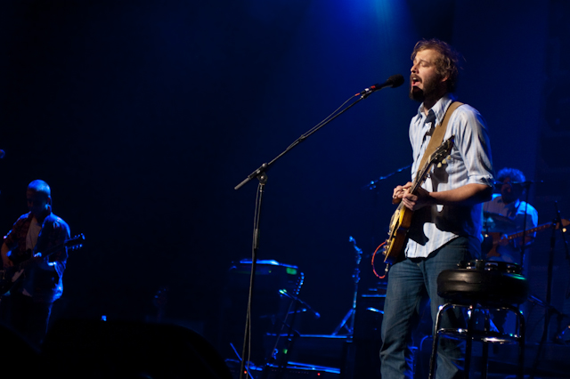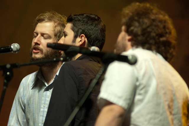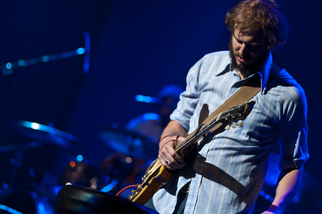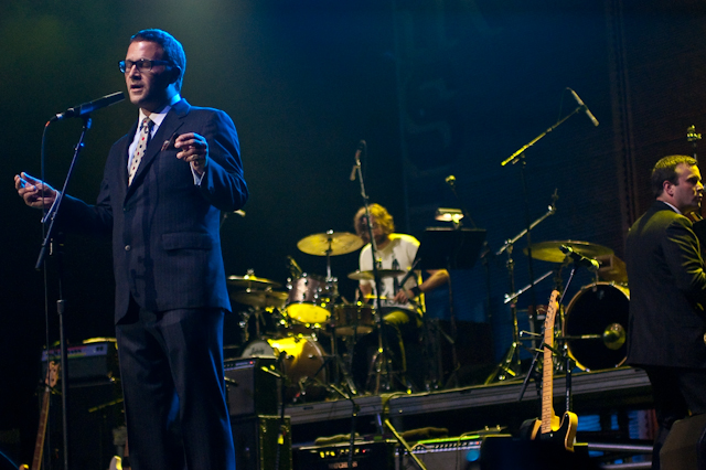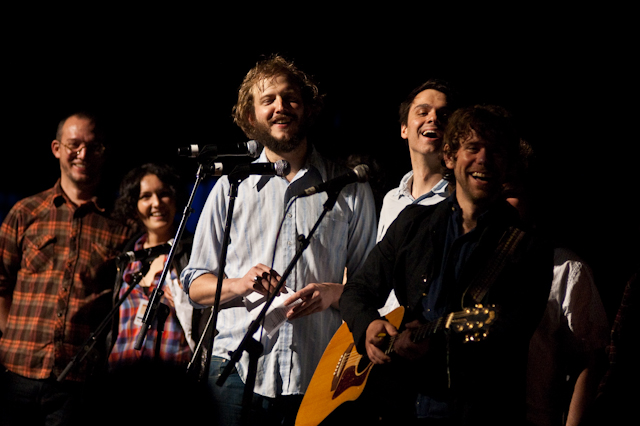 I logged the night blow-by-blow on Twitter, but it probably bears repeating. Before that, some general observations: These sorts of charitable all-star endeavors are never competitions, except that they totally are competitions, so I'm giving the night's MVP award to Justin Vernon aka he who straight crushed it. To be fair, as a friend noted, everyone straight crushed it. But not everyone was straight invited to collaborate as much as Bon Iver, and with much respect to Mr. Byrne, nobody got more applause at the mere mention of his name, let alone after (or even during) his performances. He was a constant presence onstage, and elevated everything he touched, subbing admirably for Gibbard on Feist's "Traing Song," plying blustery blues licks to the National's new song, backing up David Byrne on his old Red Hot tune with Caetono Veloso, creating the vocal powerhouse moment of the night in trading verses with My Brightest Diamond on his stately and hypnotic "Flume."