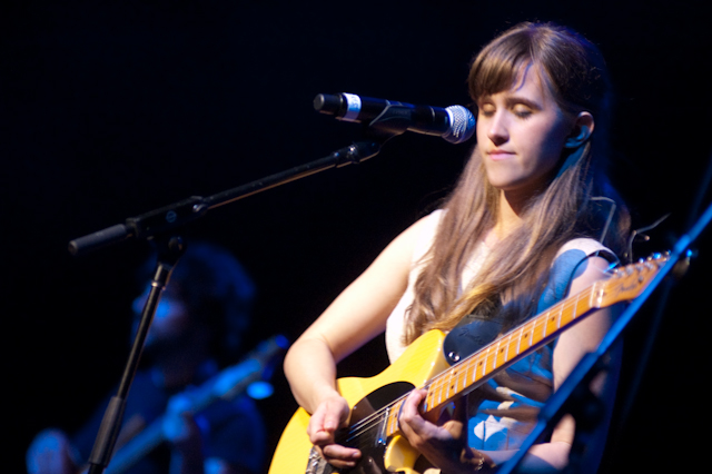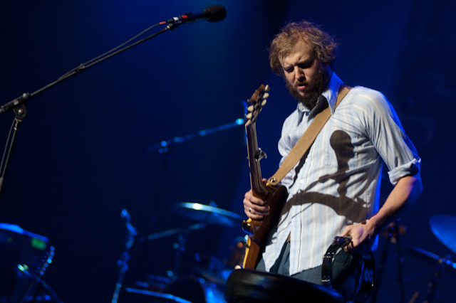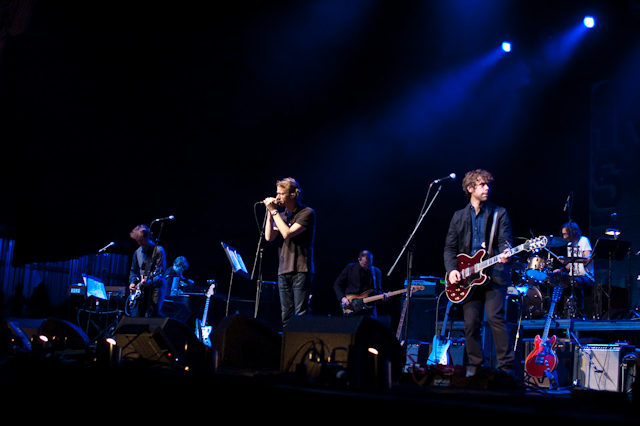 After Dirty Projectors' show open and some video during stage turnover came Shara Worden, doing her take on "Feeling Good" as popularized by Nina Simone with the night's ostensible house band: Aaron and Bryce Dessner on guitars (of the National, and of course of Organizing DWTN fame), the National's Bryan Devendorf on drums, and Doveman on keyboards. People were impressed with this performance. This is because Shara knows how to sing. Well. The switch over to the National was easy: just swap a pint-sized vocal dynamo in a silver dress for a tall, young-professorial looking baritone dude. Berninger was low-key as ever, kicking off "Slow Show" with rasp and husk, paying his props to his bandmates for their incredible work benefiting those living with HIV/AIDS, and introducing two new songs: one of which had a name I couldn't catch, but had an intro very reminiscent of Sufjan's "Concerning The UFO Sighting Near Highland, Illinois" (and a smoking Bon Iver guitar solo), and another that I could sorta catch but was mumbled so sounded something like "Vanderlyle Crybaby," even though I realize there is no such thing as a Vanderlyle (yet).