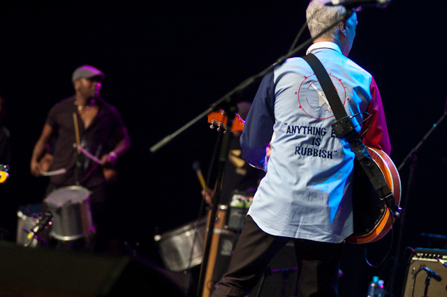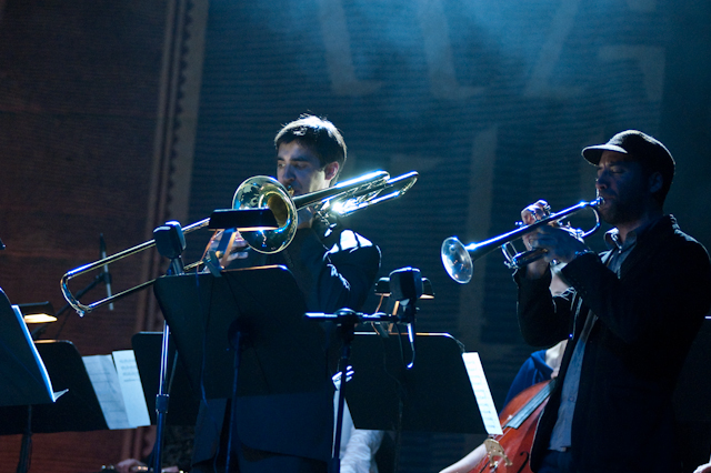 After that it was TV On The Radio brain Dave Sitek dapper in a suit, crooning his compilation contribution "With A Girl Like You" along with his favorite horn dude Stuart Bogie, and that led to the aforementioned David Byrne three-song First Act closer. This started with a percussion line dancing its way through, followed by an even more impressively dancing Byrne, to his cover of Cole Porter's "Don't Fence Me In" which appeared on the first Red Hot comp. For his Caetano Veloso collab track from the Lisbon Red Hot comp, he couldn't get Caetono, so we settled for a Bon Iver. ("Sorry!" joked Byrne, because he is a funny man.) The next was a collab with Leslie Feist. Again, memories.