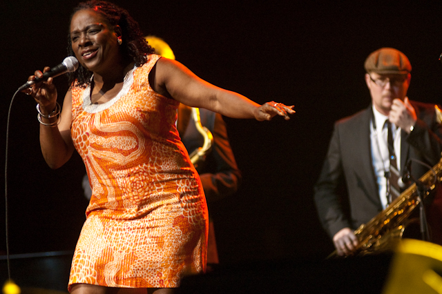 If not Bon Iver, then OK, David Byrne. His turn with Dirty Projectors was great, and his position as godfather of the Red Hot project was rightfully celebrated in word, and by a three-song set that closed Act One, featuring previously unperformed songs Byrne had contributed to previous Red Hot comps. There were percussion lines, Bon Ivers, and crazy footwork. And if not David Byrne, then Sharon Jones, who brought Radio City to its feet during her set, then created some memories on this encore...