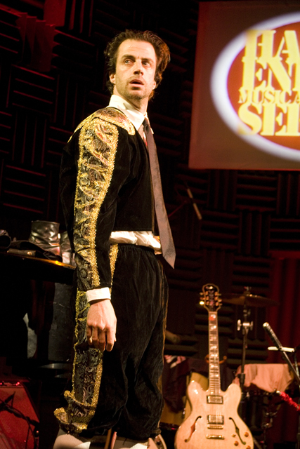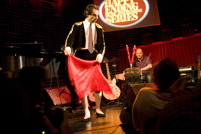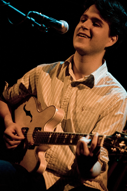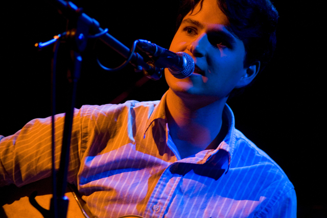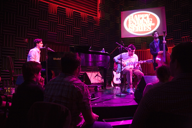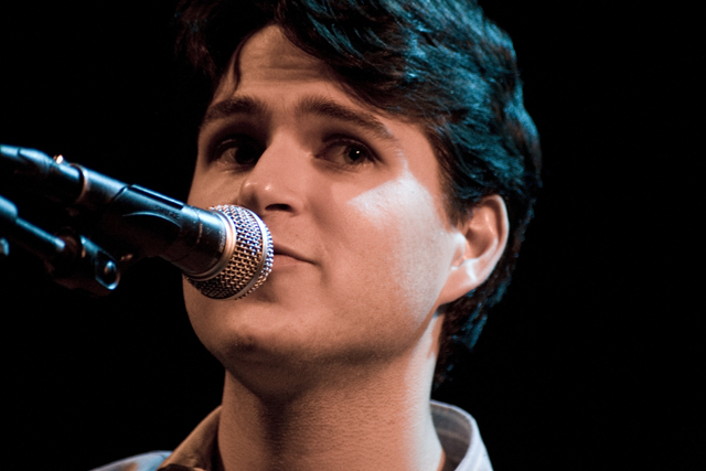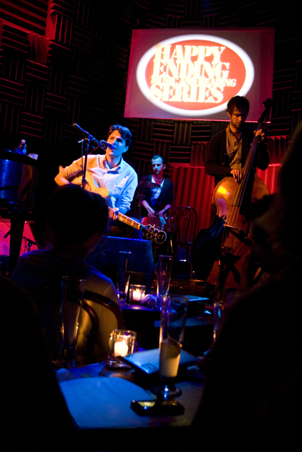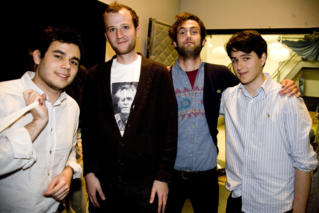 Despite selling out in five minutes, and despite featuring Vampire Weekend playing Vampire Weekend songs, last night's early show at Joe's Pub was an atypical night with the band. They performed as the Music portion of the Happy Ending Music & Reading event, part of a series organized and hosted by Amanda Stern, bringing together Writers To Watch (they have hype in the literature world) and musical acts to trade off readings and songs. It was a funny mix of indie kids, wine-sipping book editors, and cat-calling literary groupies, and maybe not everyone knew Vampire Weekend before, but everyone definitely loved the shit out of "Oxford Comma."