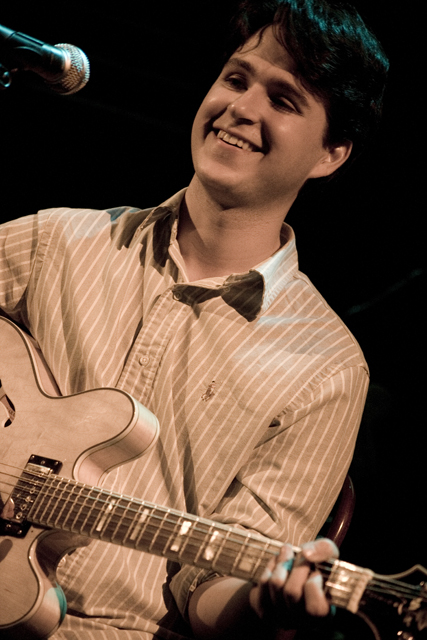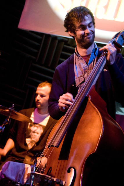 These days Vampire Weekend are holed up in the studio working on LP2, so the (business) casual vibe at Joe's seemed to offer some welcome relief. No new songs were played, although old songs were played newly: All participating in the event had to "Take A Public Risk," which Vampire Weekend accomplished via a number of firsts: the Chrisses traded instruments for the set (Baio on drums, Tomson on bass); "Walcott" was rearranged into a "roundup" version (a mildly jazzy/swinging halftime thing); Tomson offered the band's double-bass debut; and "M79" was performed four-piano-hands style, Rostam and Ezra sharing the grand piano.