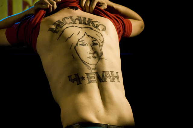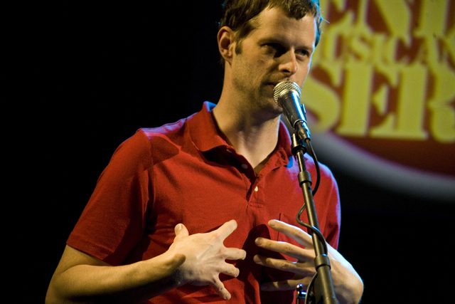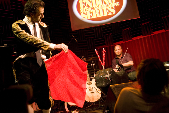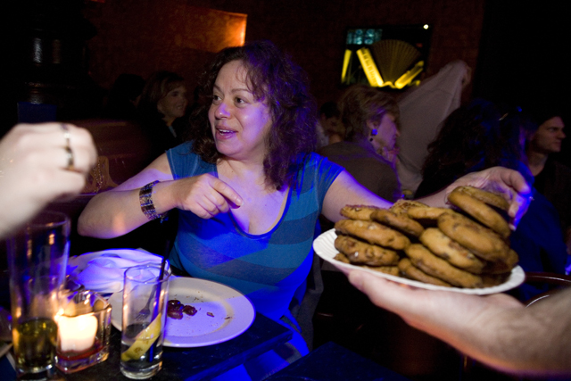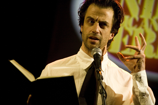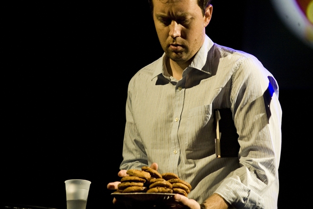 A word on the authors to help you understand Santiago Felipe's photospread. I was told last night's wordsmiths were a particularly beloved bunch: Wells Tower, who read a hilarious piece from his new short-stories collection Everything Ravaged, Everything Burned; John Wray, excerpting an intense passage from his acclaimed Lowboy, your average story about a schizophrenic teen riding NYC's subways in search for a woman to fuck in order to save the world; and Arthur Phillps, whose The Song Is You inspired constant guffaws and is the most likely to wind up in your hands as a gift someday. ("It's about music, and bands, and going to see bands.") The readings themselves didn't fit the Taking Risks theme -- there is little risk involved in public speaking for writers that look like actors -- so they performed tiny self-dares instead. Wells thought there was risk in bringing two things he loved that didn't go together, together -- chocolate chip cookies and bacon, obvs -- which digressed into an anecdote about trying to fly to NYC with a huge ball of cookie dough that resembled C-4 embedded with semi-sweet chocolate morsels. Wray publicly debuted his back tattoo of NYT literary critic Michiko Kakutani (aka know your audience). Arthur Phillips announced his retirement from writing and intention to become a full-time bullfighter, changing outfits and olé-ing with a styrofoam bull mounted on a remote controlled car. Writers are weird.