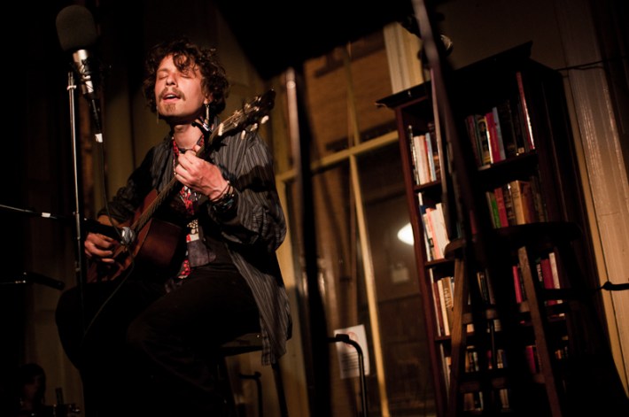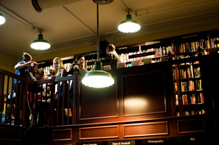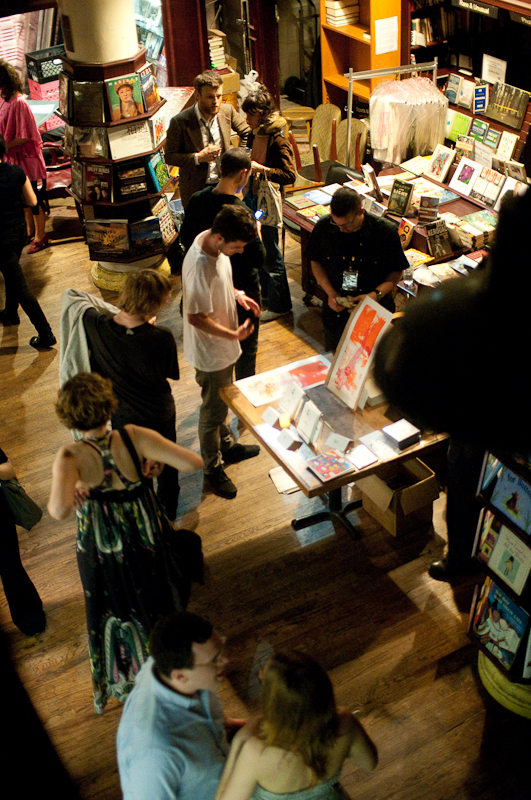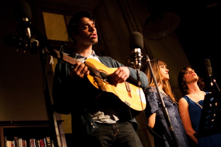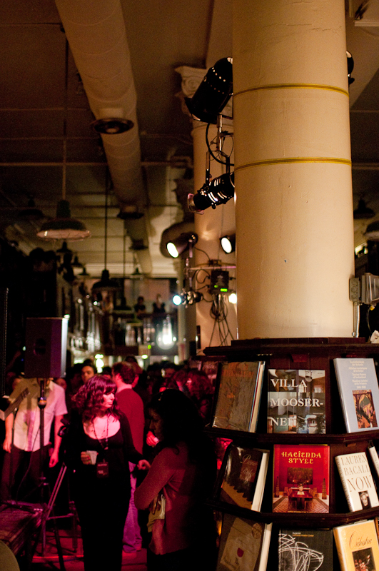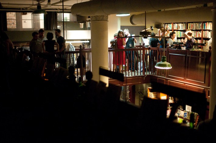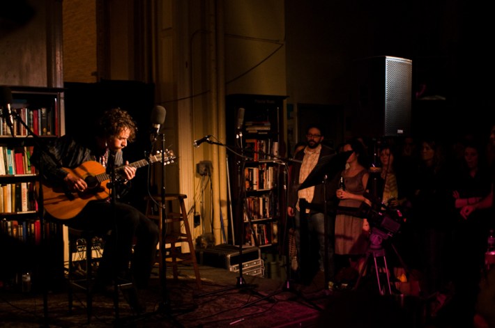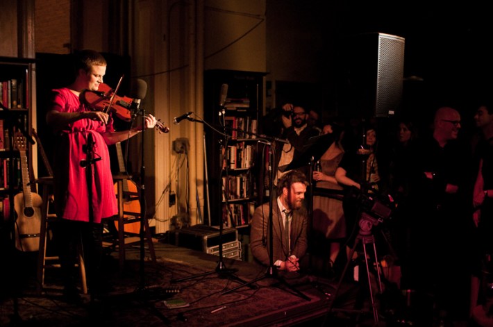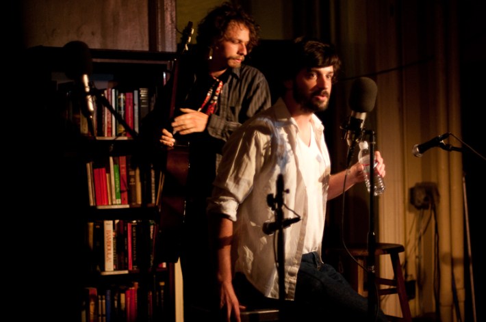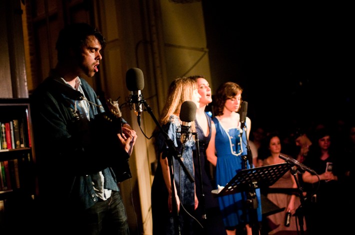 What started as a mutual admiration uncovered by Dirty Projectors' cover of "Hyperballad" for Enjoyed crystallized into an unforgettable evening of Bitte Björka at Housing Works Bookstore in SoHo on Friday. Our very own Brandon Stosuy worked tirelessly to conceive and bring it to reality (Brandon is a HW board member and this event was a benefit for the charity). There was a balcony for those designated VIP; there were tables and chairs for the most charitably generous with their ticket money; and there was every other space in the store, filled with some 250 others -- from M.I.A. to St. Vincent to David Byrne to Vampire Weekend to Battles to Four Tet to Kría Brekkan to the National to, uh, Haley Joel Osment -- milling about and cramming the stage. Dirty Projectors' four-song set from Bitte Orca was tailored to the evening, and to maximizing the evening's setup: all the voices, none of the drums, Dave on guitar and Nat Baldwin on upright bass. This meant acoustic versions of songs that were generally electric -- "Temecula Sunrise," "Cannibal Resource," "No Intention," "Remade Horizon" -- and no "Two Doves," because as beautiful and acoustic as it is, it is only one voice, and Longstreth was trying to acclimate and prepare four of them. As warmup material, songs from Bitte Orca are embarrassingly rich drill bits. But Friday night they were in fact warmup material, for Dirty Projectors, and for the crowd.