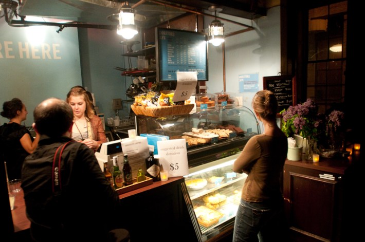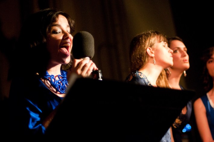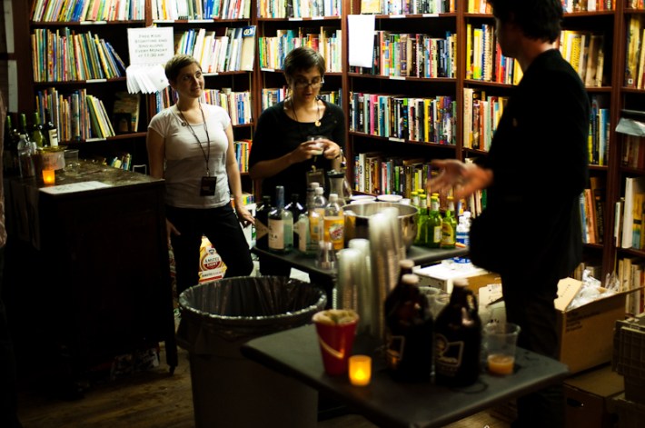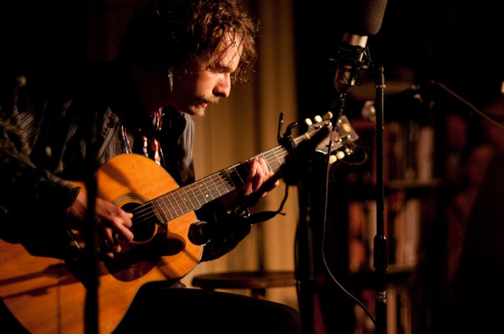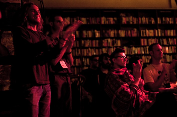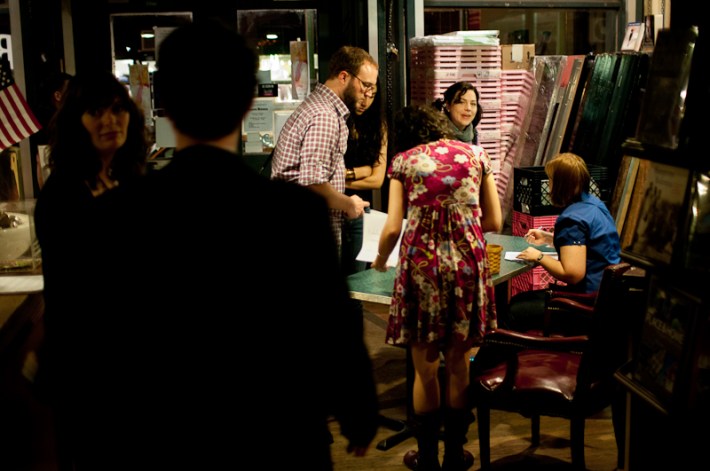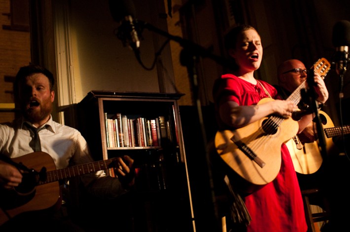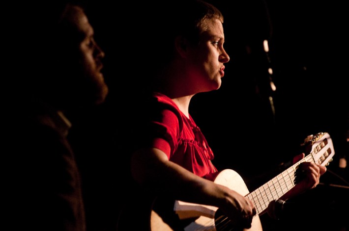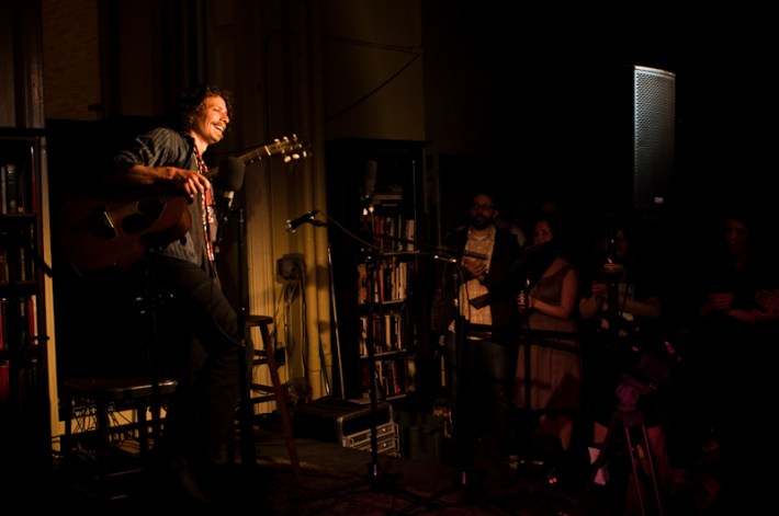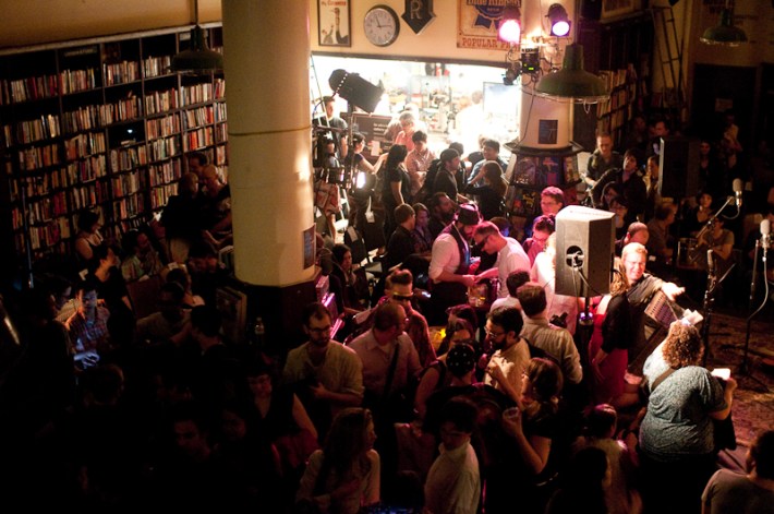 What started as a mutual admiration uncovered by Dirty Projectors' cover of "Hyperballad" for Enjoyed crystallized into an unforgettable evening of Bitte Björka at Housing Works Bookstore in SoHo on Friday. Our very own Brandon Stosuy worked tirelessly to conceive and bring it to reality (Brandon is a HW board member and this event was a benefit for the charity). There was a balcony for those designated VIP; there were tables and chairs for the most charitably generous with their ticket money; and there was every other space in the store, filled with some 250 others -- from M.I.A. to St. Vincent to David Byrne to Vampire Weekend to Battles to Four Tet to Kría Brekkan to the National to, uh, Haley Joel Osment -- milling about and cramming the stage. Dirty Projectors' four-song set from Bitte Orca was tailored to the evening, and to maximizing the evening's setup: all the voices, none of the drums, Dave on guitar and Nat Baldwin on upright bass. This meant acoustic versions of songs that were generally electric -- "Temecula Sunrise," "Cannibal Resource," "No Intention," "Remade Horizon" -- and no "Two Doves," because as beautiful and acoustic as it is, it is only one voice, and Longstreth was trying to acclimate and prepare four of them. As warmup material, songs from Bitte Orca are embarrassingly rich drill bits. But Friday night they were in fact warmup material, for Dirty Projectors, and for the crowd.