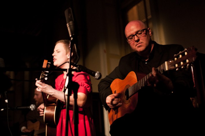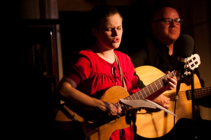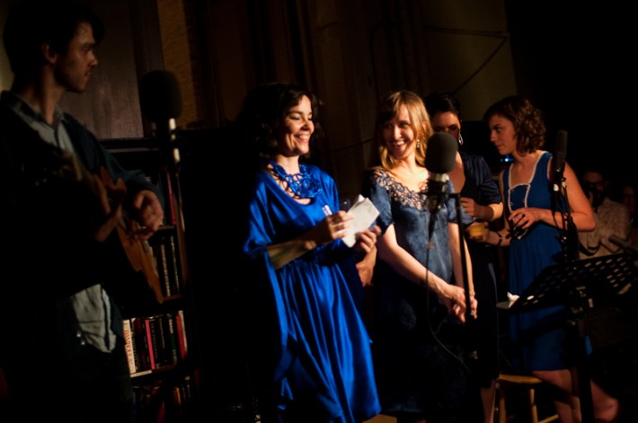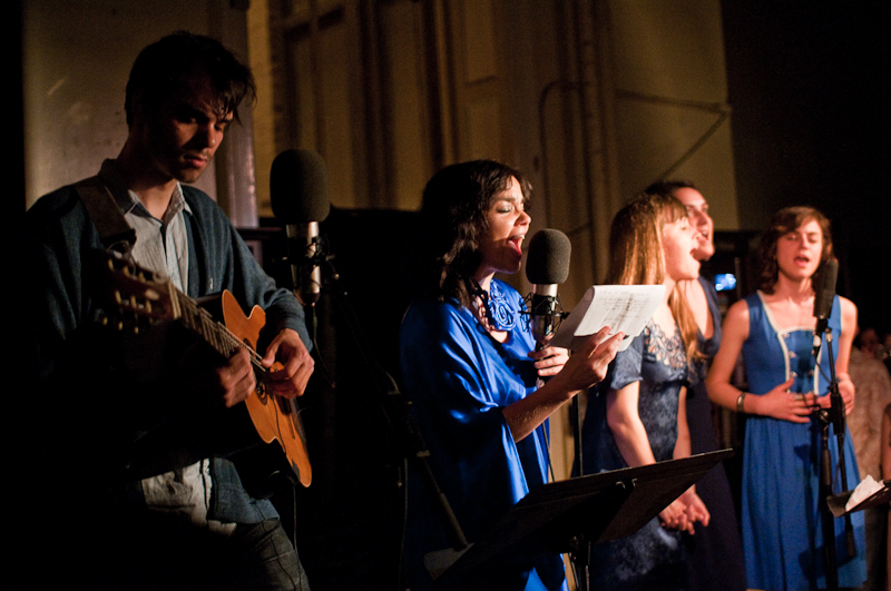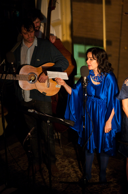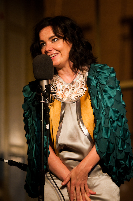 This all looks pretty 19th century, but the inspiration is really 17th: Björk and I had been talking about the birth of opera in Italian song forms: madrigals and chanson and stuff.Housing Works Bookstore reminded us of early Italian concert halls, which relied on the singers ability to project and the natural amplification of the space. She's done a tour where she played in these spaces, and it was fascinating to learn about it from her.We wanted the show to have that feel. Eventually, songs 5/6 will be full duets between B and me, and 7 will have a full on polyphonic ensemble feel, Gesualdo style.