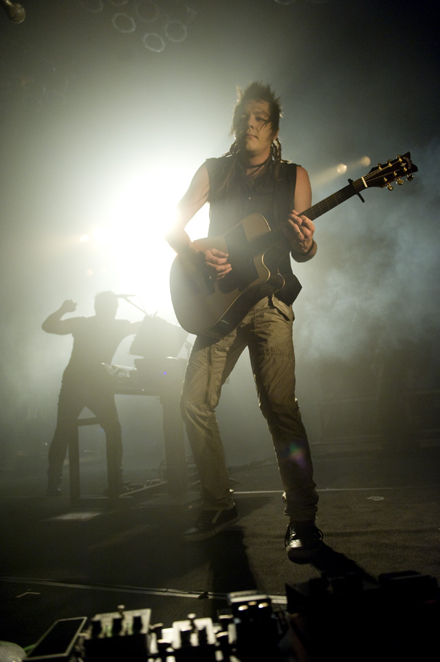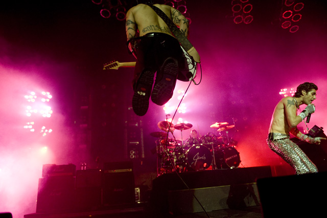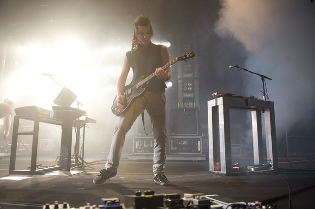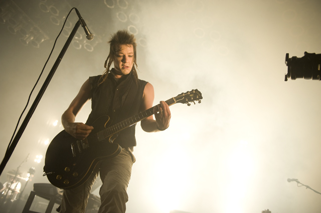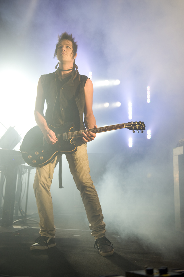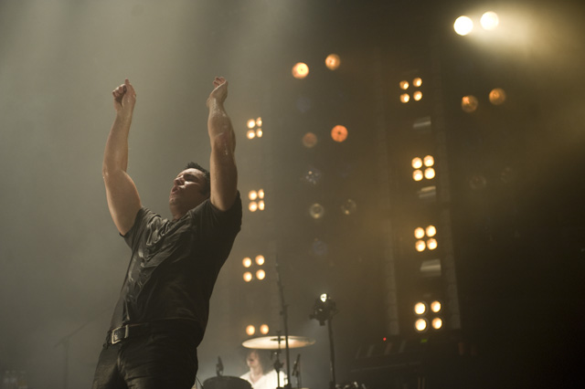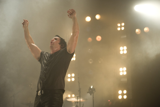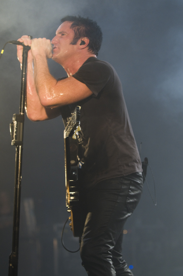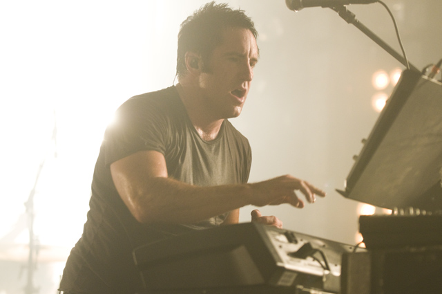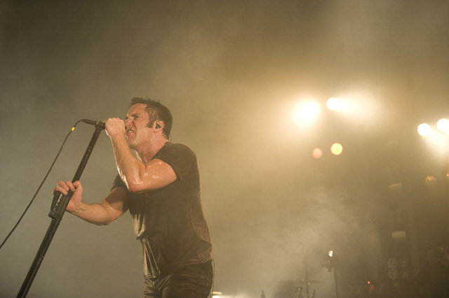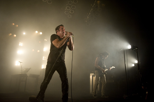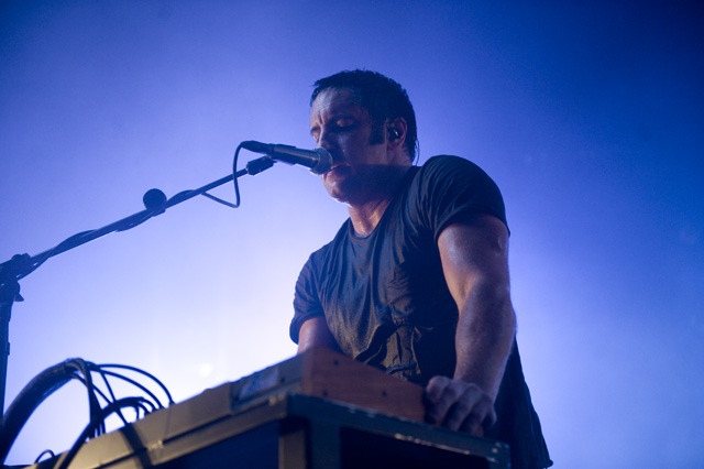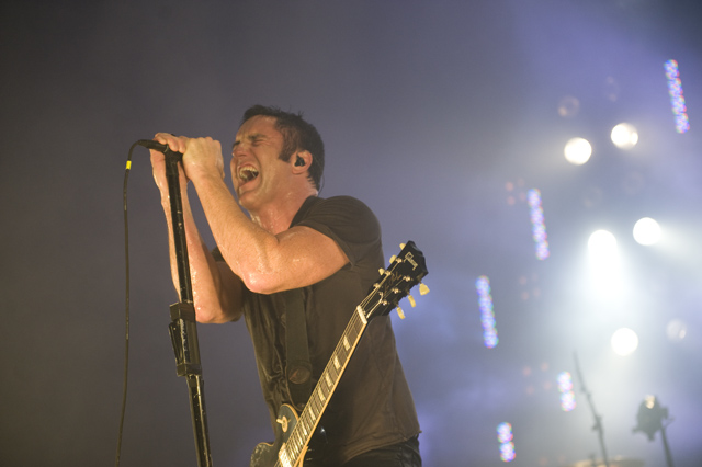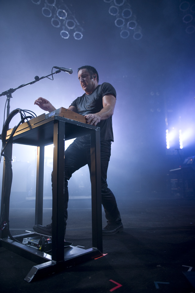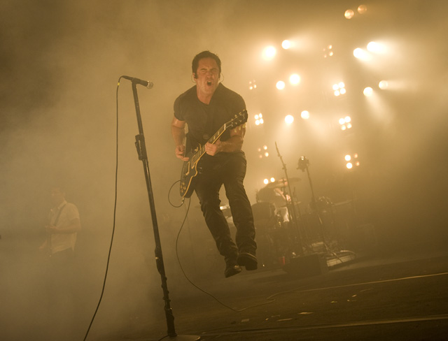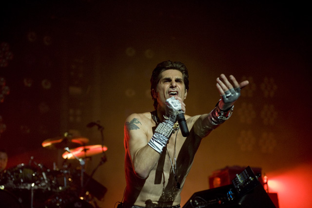 Things may be tense backstage, but the members of Nine Inch Nails and Jane's Addiction remain consummate showmen. And while NIN|JA may be a bit (okay, a lot) of a nostalgia trip, this isn't your father's alt rock ampitheatre tour. For starters everyone's sporting much shorter hair and much larger biceps, but more importantly it is very techy! Practically every musician involved is documenting the trek via Twitter -- newly engaged Trent Reznor is also Tweeting ticket giveaways -- and a "relaxed" camera policy ensures an influx of YouTube uploads after each gig. (Not that you'll capture anything worthwhile under the strobes and super bright back lighting. But you're free to try.) Regular opening act Street Sweeper Social Club had the night off so NIN were first onstage at the Pearl last night. Their set did not include the familiar Bowie cover heard at previous stops, but it did end with Ilan Rubi pounding his snare so hard on "Hurt" his stick broke. JA's set was more lighthearted, with Perry Farrell describing a homoerotic dream and telling a joke about snorting a rail off of Dave Navarro's dick ("it was a short rail"). Or maybe that wasn't a joke. One cameraman was dressed as a ninja, so that dude should get a raise. Andrew Youssef's photos and setlists await after the jump. There were three songs with "pig" in the title.