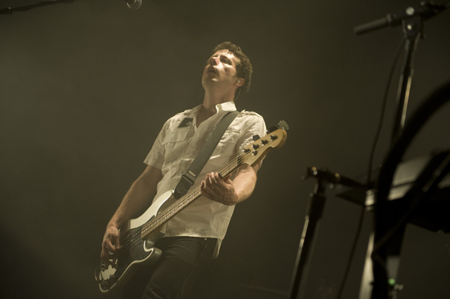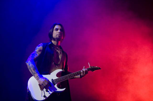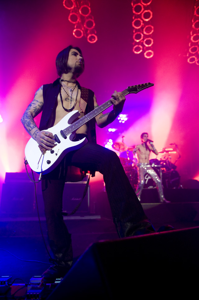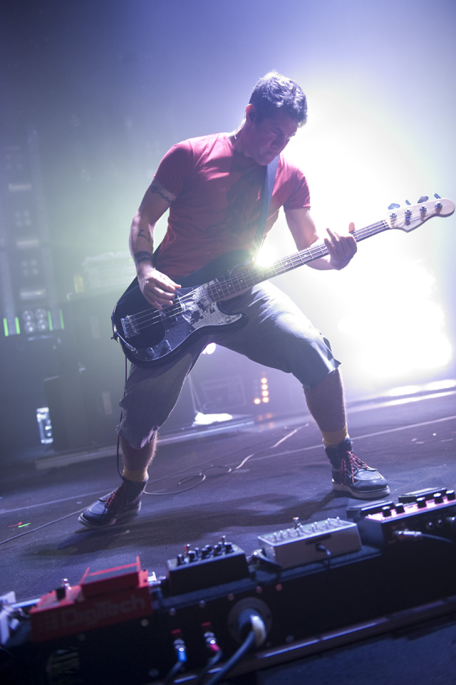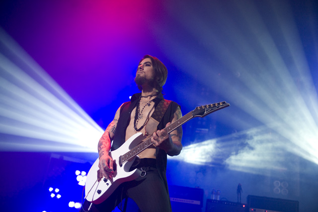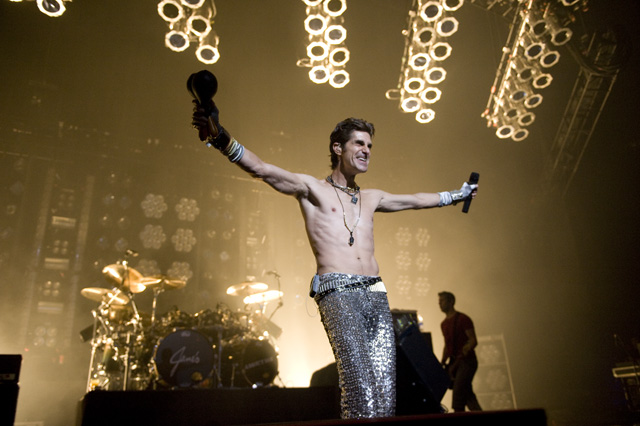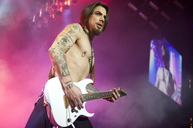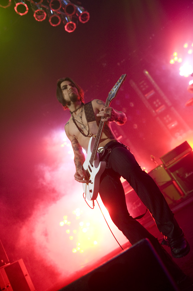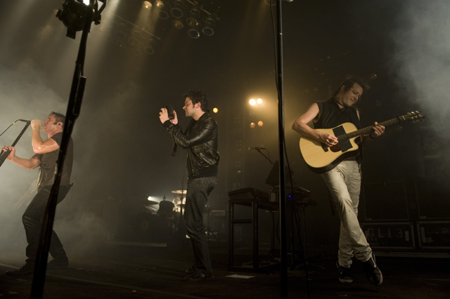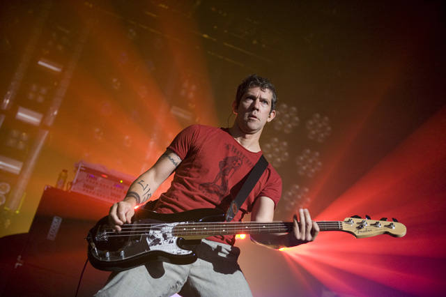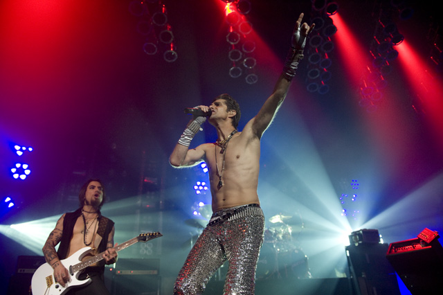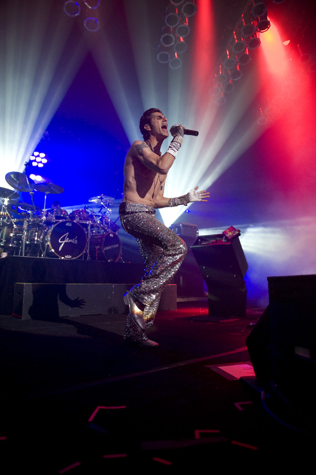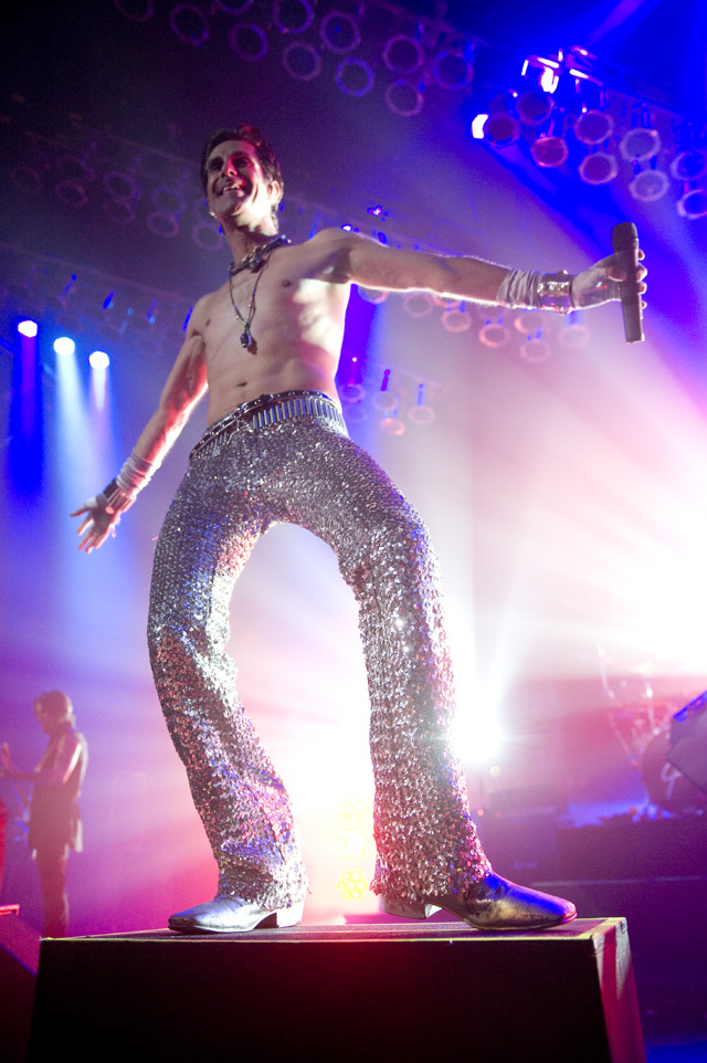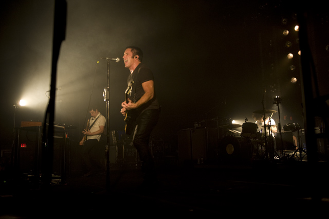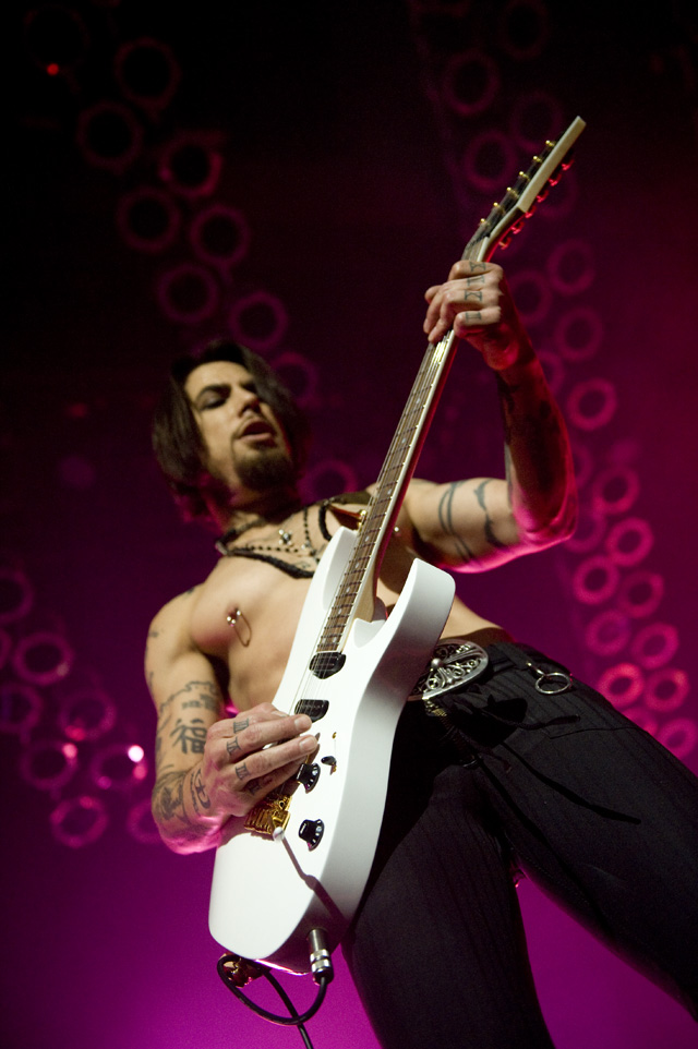 Things may be tense backstage, but the members of Nine Inch Nails and Jane's Addiction remain consummate showmen. And while NIN|JA may be a bit (okay, a lot) of a nostalgia trip, this isn't your father's alt rock ampitheatre tour. For starters everyone's sporting much shorter hair and much larger biceps, but more importantly it is very techy! Practically every musician involved is documenting the trek via Twitter -- newly engaged Trent Reznor is also Tweeting ticket giveaways -- and a "relaxed" camera policy ensures an influx of YouTube uploads after each gig. (Not that you'll capture anything worthwhile under the strobes and super bright back lighting. But you're free to try.) Regular opening act Street Sweeper Social Club had the night off so NIN were first onstage at the Pearl last night. Their set did not include the familiar Bowie cover heard at previous stops, but it did end with Ilan Rubi pounding his snare so hard on "Hurt" his stick broke. JA's set was more lighthearted, with Perry Farrell describing a homoerotic dream and telling a joke about snorting a rail off of Dave Navarro's dick ("it was a short rail"). Or maybe that wasn't a joke. One cameraman was dressed as a ninja, so that dude should get a raise. Andrew Youssef's photos and setlists await after the jump. There were three songs with "pig" in the title.