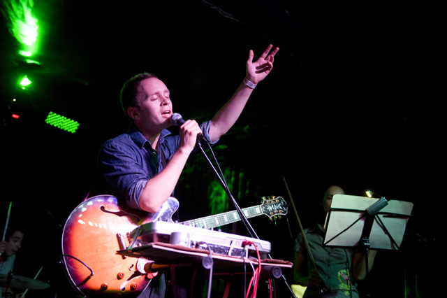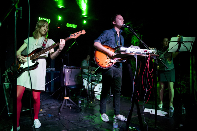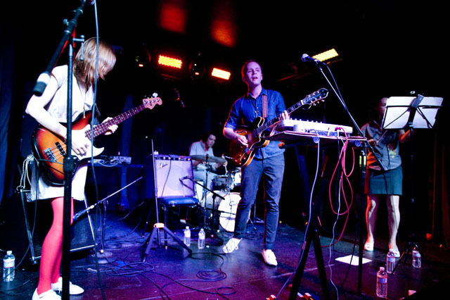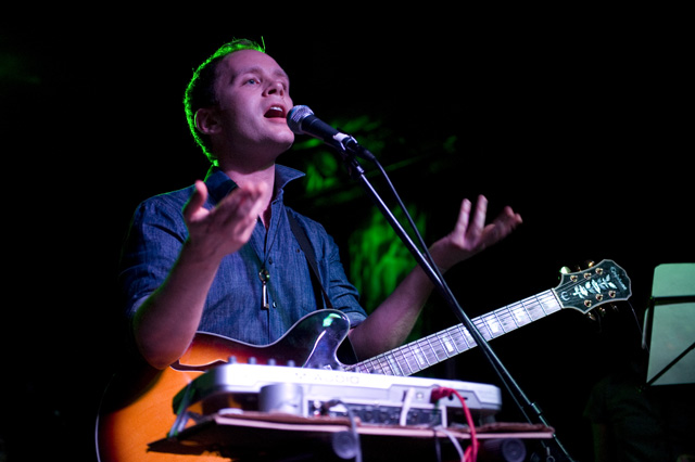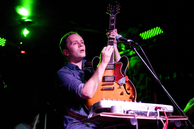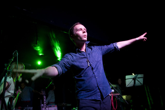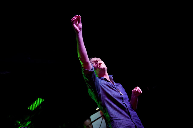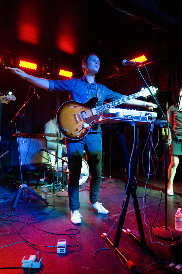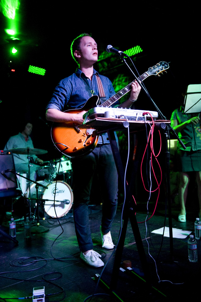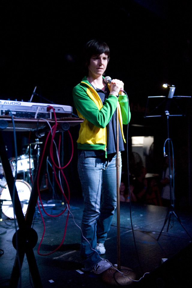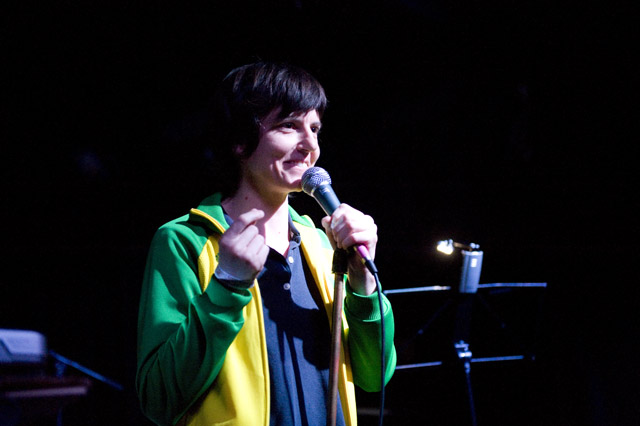 We haven't seen a solo headliner from Mr. Indie Rock Class of '07 since, well, sometime in '07. I think the word "wit" was used like 50 times then, and two more years means two more years for Jens to get more charming. You can tell by the airplane motions in Andrew Youssef's photos that Lekman did "Sipping On Sweet Nectar," along with a couple of unreleased songs (according to the Jens Lekman Song Index): "The End of The World is Bigger than Love" (a song about putting things into proportion); "New Directions" (a song about using Google Maps and the life directional metaphors therein -- you can hear at 8:17 of this NPR webcast from last year's SXSW); and "An Argument With Myself" (a song about an argument with yourself). A girl in the crowd got a singular serenade, so imagine the swoons there, and "A Postcard To Nina," which is not a political song, got its political preface: "What's This Proposition 8 bullshit that's going on?" Nina, you should be with your girlfriend. However you'd like to be. Opening the set was comedian Tig Notaro who you'll recognize as Tig the lesbian cop from The Sarah Silverman Program because you watch that program because you're smart.