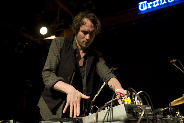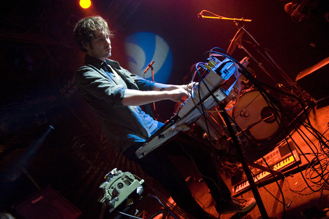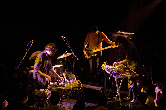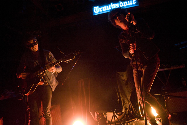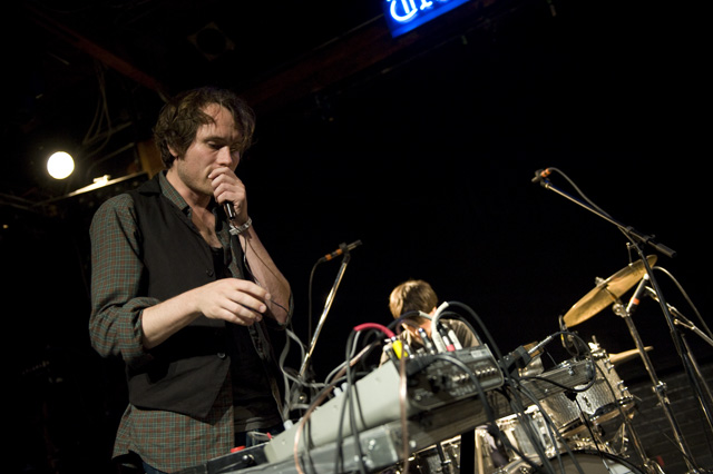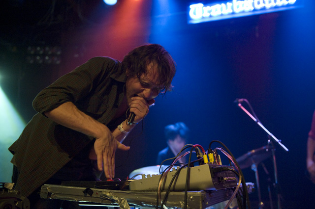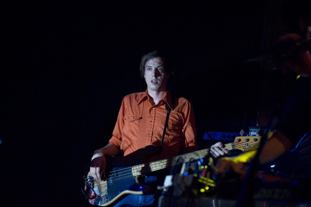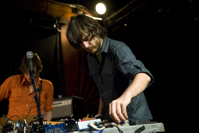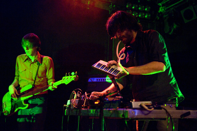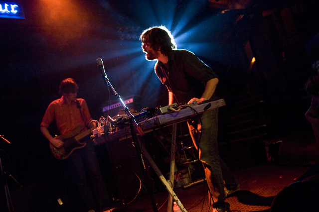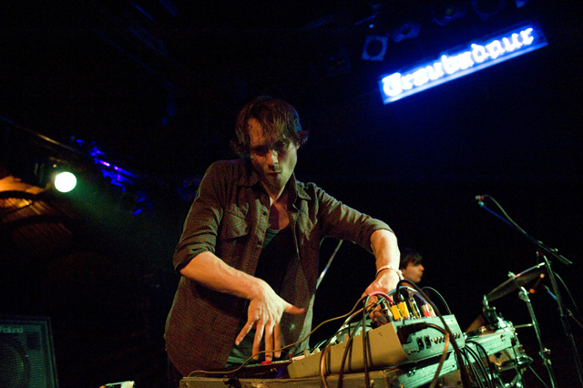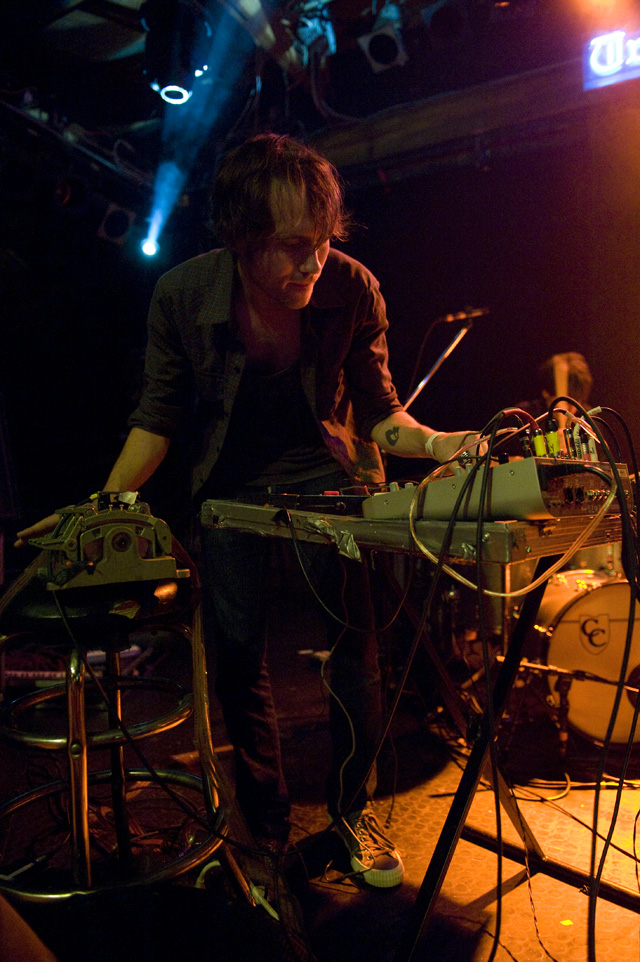 Saturday's double-bill at the Troubadour yielded a couple of fun facts. First, we learned that the night's opener, BTW Crocodiles, were being filmed for a profile on an upcoming episode of your favorite late night TV program, Last Call With Carson Daly. (Apparently the cameramen didn't care much for the fans they had to push past; it was probably mutual.) Also we learned that along with finding the sonic potential in just about any object and endorsing Chrysler automobiles, Holy Fuck love their Indian food. (They sat next to photographer Andrew Youssef at Taste Of India before the show.) Lots Of Love. In addition to that tandoori revelation, the band played new material. We'll dig that up if we can, for now enjoy yourself with Andrew's pics of the night.