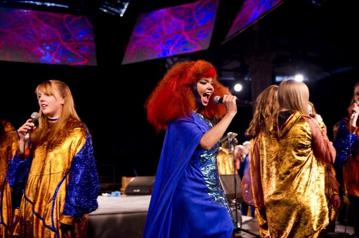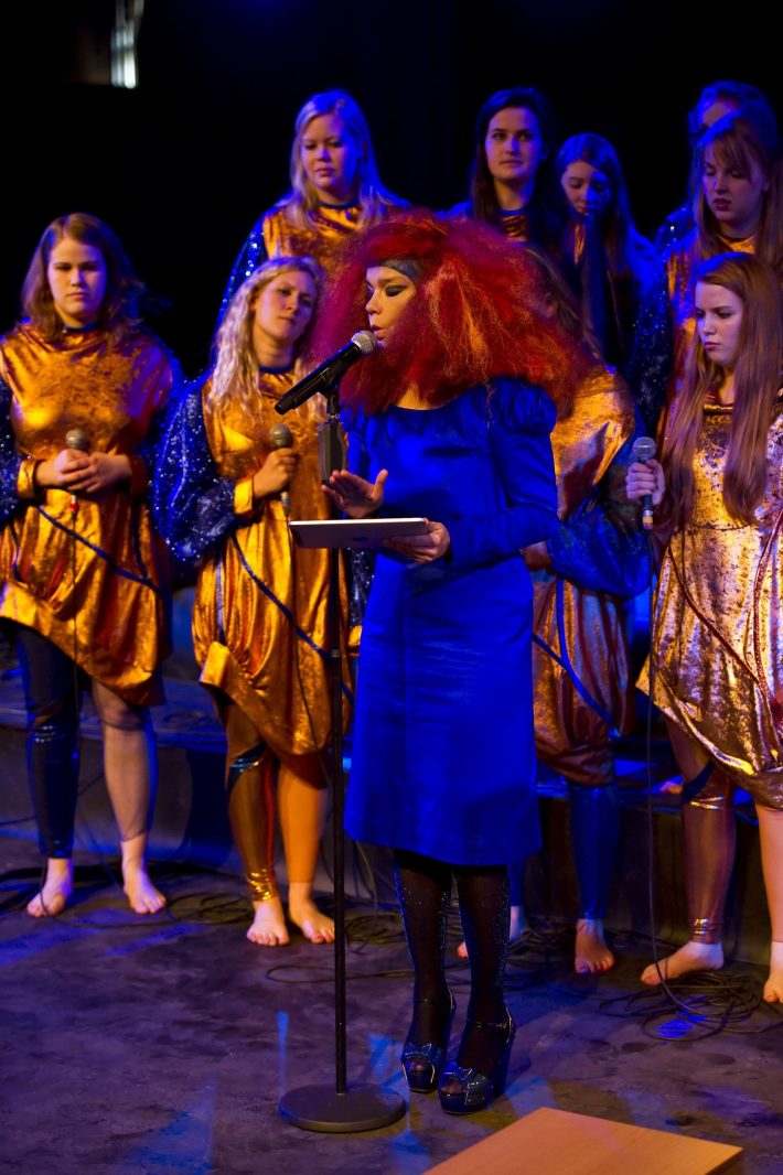 Björk: I think that’s just the set yea because kids can, on our days off, when we don’t do our show, the kids will come and they will actually be on the stage and write songs with them. So I think that’s what they’re calling installations. Or some other things could cross over into being installations? For example, we don’t know if we can afford the choir, because it’s like 24 of them, but we just about found somebody to fund them to bring them to Manchester, obviously they live in Iceland and they can be there for the Icelandic concerts in the Autumn. But I also recorded them with each voice on their own and we were thinking we could have 24 speakers in a circle and then you could have an app that could play with the song and then the choir would come out of these speakers and you could walk up to each speaker and hear the voice individually. That for me is not an installation…
