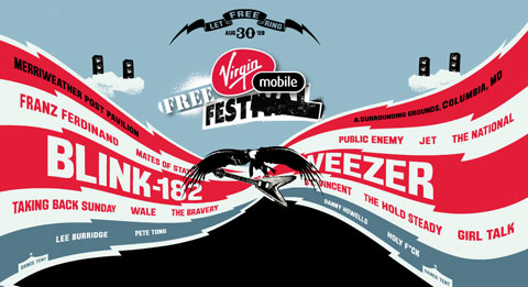Citing "all the bad news about the economy and the layoffs," Virgin Mobile has rebranded its fourth annual American music festival the Virgin Mobile FreeFest, and has reduced its price of admission from a lot of dollars to no dollars at all. An exec for the company tells Billboard they were just trying to "put a smile on people's faces." With the details we have it's hard to be cynical about this, and you know how much I love being cynical about everything. Weezer and Blink-182 headline, and the undercard is no OzzFest shit show either, including St. Vincent, the Hold Steady, Holy Fuck, Girl Talk, Public Enemy, Franz Ferdinand, Taking Back Sunday, and Pete Tong. Yes also the Bravery and Jet, but let's just take it easy now. It's free.