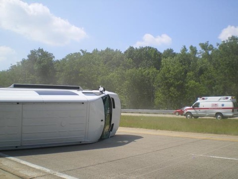 After stopping at a fruit stand at about 3pm today, we got back on the highway headed towards Toronto. At about 3:15, on the other side of the highway, a semi-truck moved into the left lane, not seeing the car that was there, and sent the car flying out of control over the meridian and right at us. The car hit us in the back and sent us flying onto our side, at which point we slid quite a ways down the road. Everyone was wearing a seatbelt except for Dave and Brian, but they and all of the rest of us luckily came out fine!