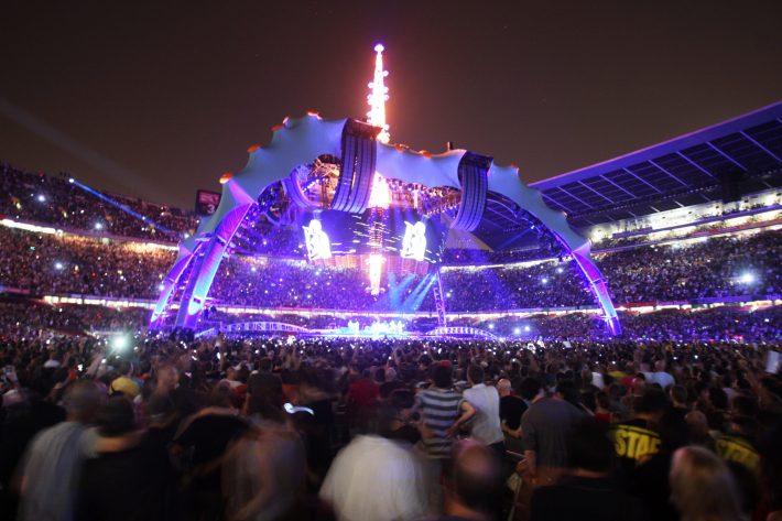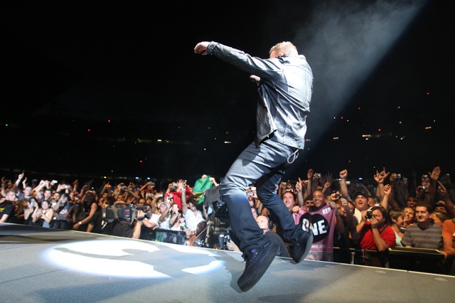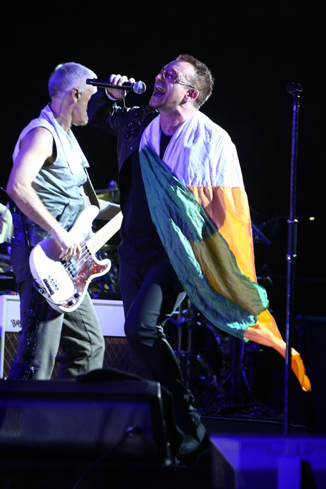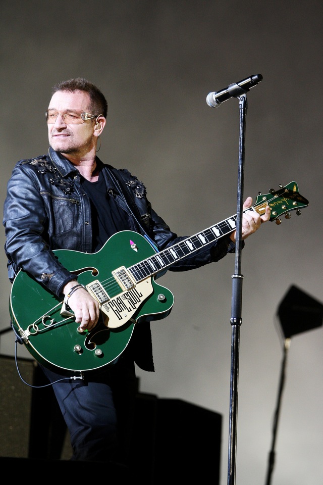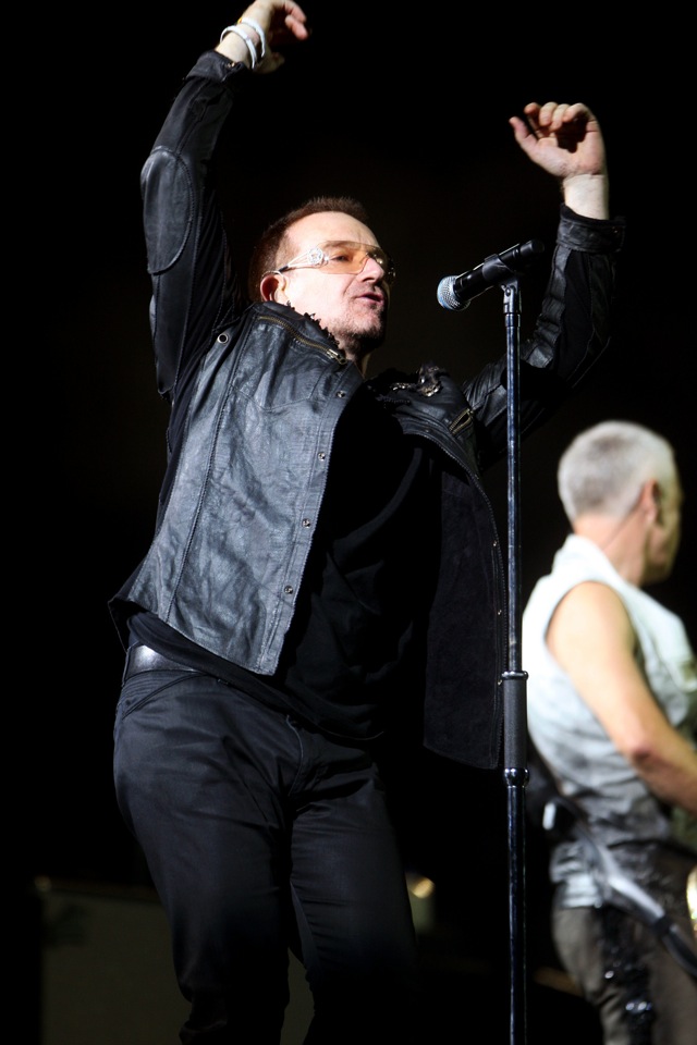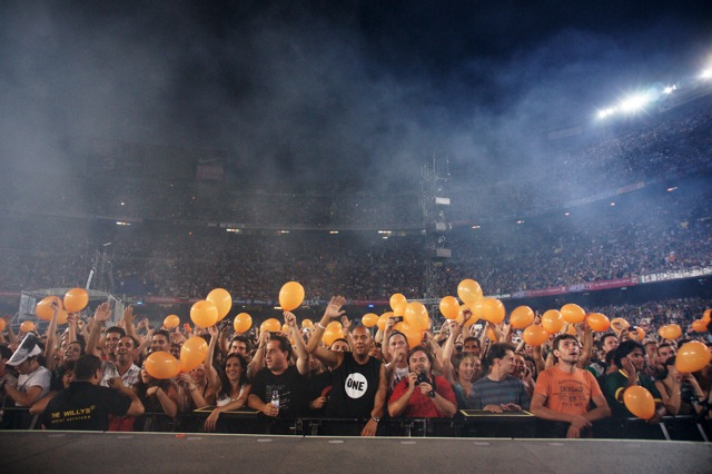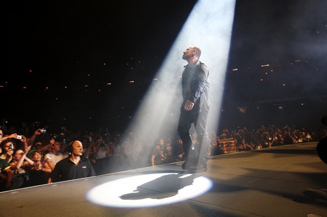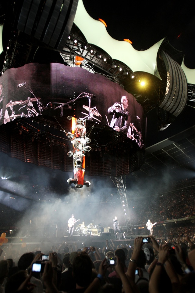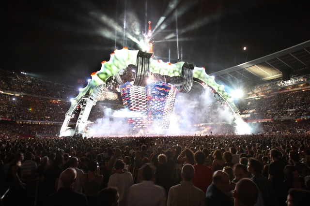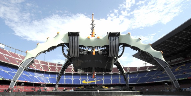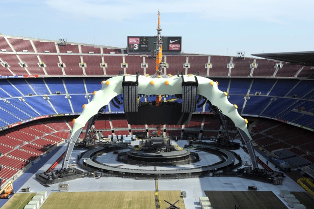 Whether they're outright taking over the Letterman show or having their latest LP remixed by Hype Machine darlings, U2 are a band that tend to go all out with their projects. Bet you didn't know that before. You're welcome. As is their m.o., the band has totally whoa-verhauled their stage show once again for the 360º Tour, which kicked off last night in Barcelona and has thoroughly redefined "performance in the round." Apparently they spent two weeks rehearsing for the show, and judging by these photos I'd believe it took them just as long to erect the monstrous altar to U2's collective ego (or, stage). It looks sensational, obvs. Along with this pic gallery, you can take a virtual tour at 360.u2.com. The setlist aimed to please and was peppered with shout outs to, and quick teases of, Michael Jackson's historic oeveure. (FYI he died last week.) We have some surprisingly good fan video to put you right in Camp Nou, followed by the night's setlist.