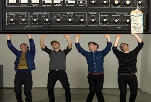 Franz Ferdiand took two stabs at a "No You Girls" video, for the "Can't Stop Feeling" they opted to squeeze two takes into single frames via all sorts of split-screen hyjinx. The guys pull and shove, do push ups and presses, sweep each other away, and end it all by slapping themselves in the face. (If their music career ever stalls, maybe a buddy sitcom would pay the bills.)A number of props -- teddy bear, hypnotizing microphone, bucket, basketball, jello-o, giant synthesizer -- are thrown into to keep your eyes doubly occupied. As far as your ears, download the "Can't Stop Feeling (WhoMadeWho Remix)" in the handy Domino widget, after taking a look.