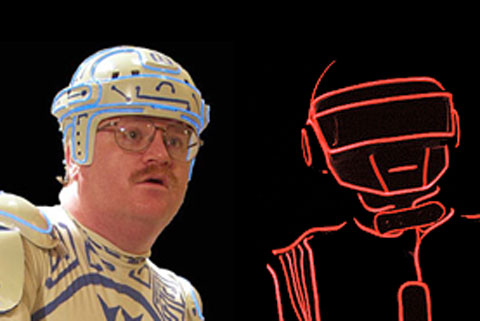 Further: the Comic-Con rumormill has it that Daft Punk will be touring their TRON: LEGACY soundtrack one day. One day after 2011 comes, that is. According to Movieline, director Joseph Kosinski was asked if Daft Punk would tour their soundtrack and he replied that there would "definitely be Daft Punk Tron-themed events on the horizon." He also said he had pancakes with the guys and that they wore their helmets. Maybe he should be insulted? We all know that if the mood is right they'll take those things off.