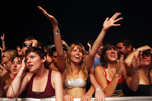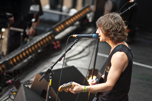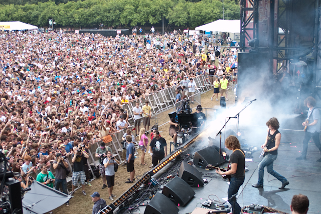 A lot of factors need to conspire to create in the perfectly memorable festival set. Sometimes it's the weather -- last weekend Fleet Foxes fed off the rain for a transportive set, but on Friday they and Bon Iver seemed tamed by it. Sometimes it's the time of day -- at Bonnaroo, Animal Collective shriveled in the sun at 2PM, but their evening set this weekend was one of the festival's most magical. (They opened with "What Would I Want Sky," inspiring majestic crowd-surfing to their blissy ambient tripouts. Definitely track down that set's unending "Fireworks.") It could just be up to the festival planners and what stage they give you -- see Passion Pit, whose slot at the tiny Citi stage demonstrated a gross underestimation of that band's appeal, but also created the circumstances for a crazy packed dance party that might have been the festival's most bonkers crowd. Or it could just be the right "time" for you as a band -- and for this one I'm talking about Arctic Monkeys. Their set at APW was fine, but something shifted for this Lolla set: Yes they stormed NYC on a wave of hype after their MySpace demos, and yes they keep playing bigger rooms when they come through, but their performance at the Budweiser mainstage had the feel of a true American coming out party. Alex is all muscles and hair and effortless charisma, the Sabbath-spiked Humbug songs don't always hit but when they do, like on "Crying Lightning," they are massive, and really to get a sense for the magnitude of this set, just take a look at the pictures of the crowd. After that set, it seemed like they've finally arrived on these shores.