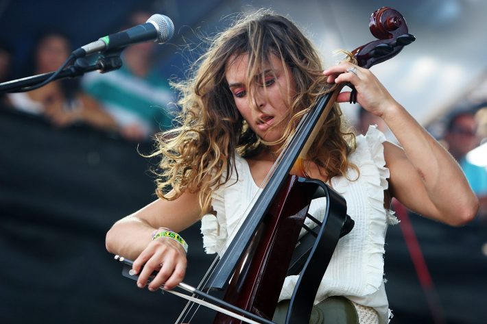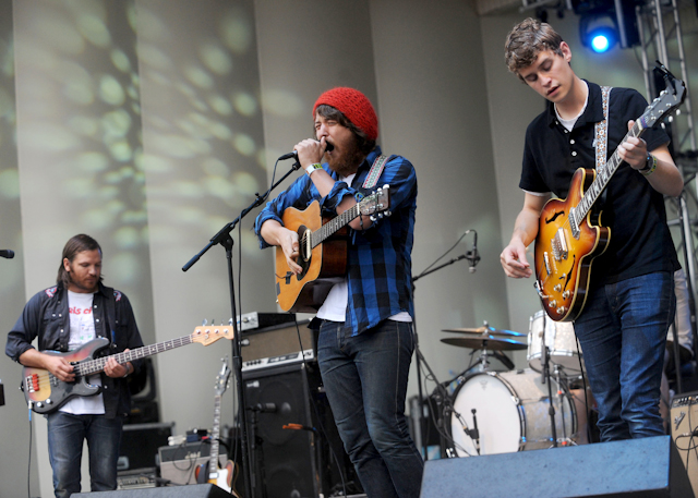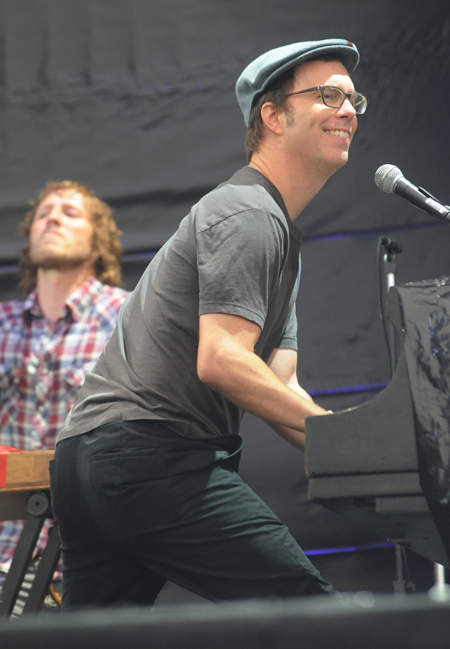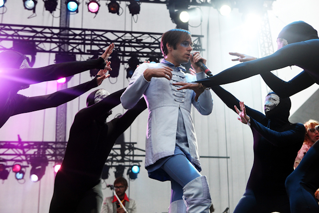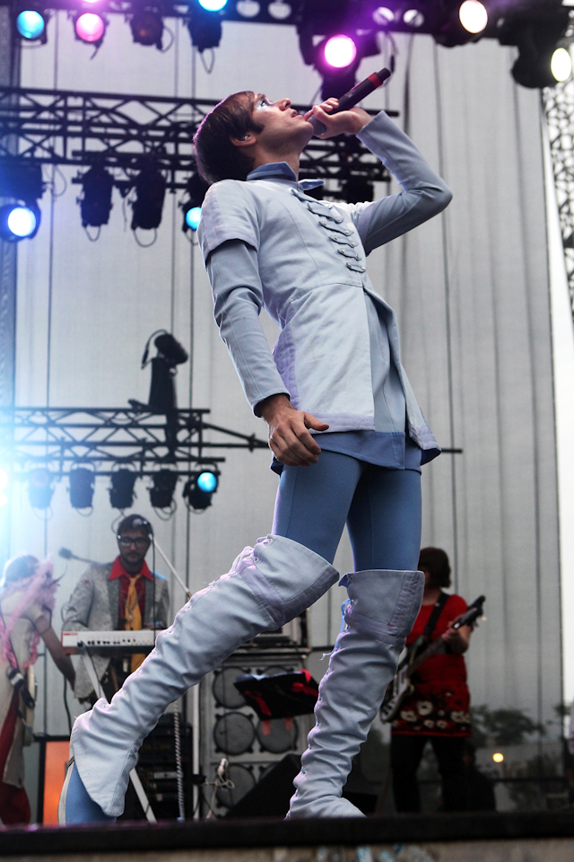 There were some notable covers, like of Montreal's "Moonage Daydream" with an assist from Janelle Monae, and Santigold's take on the Cure's "Killing An Arab." There were some notable dedications, like Los Campesinos! offering a tune in honor of the Smashing Pumpkins, and Vampire Weekend sending out "Cape Cod Kwassa Kwassa" to John Hughes here in the late, great, musical filmmaker's home city. (As you know, Vampire Weekend are admirers.) But as befitting a festival its magnitude, the most notable moments came via each night's headliners.
