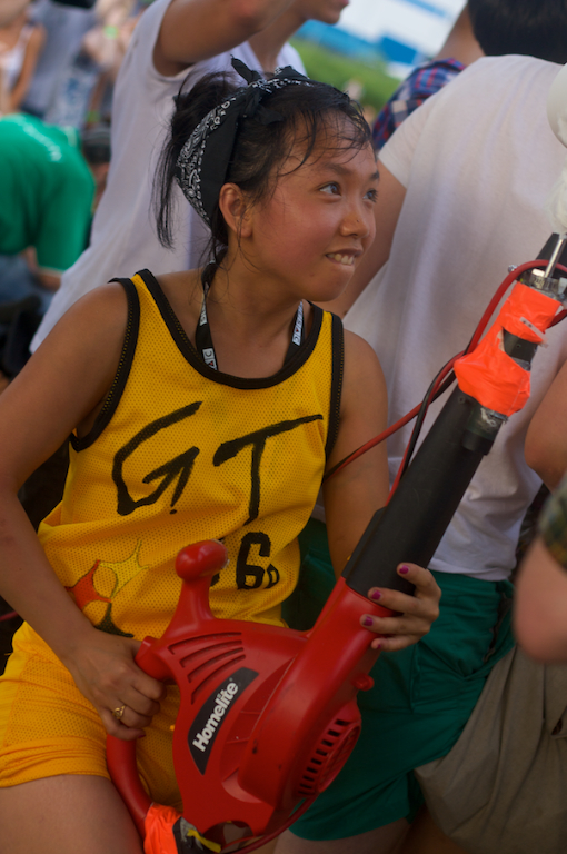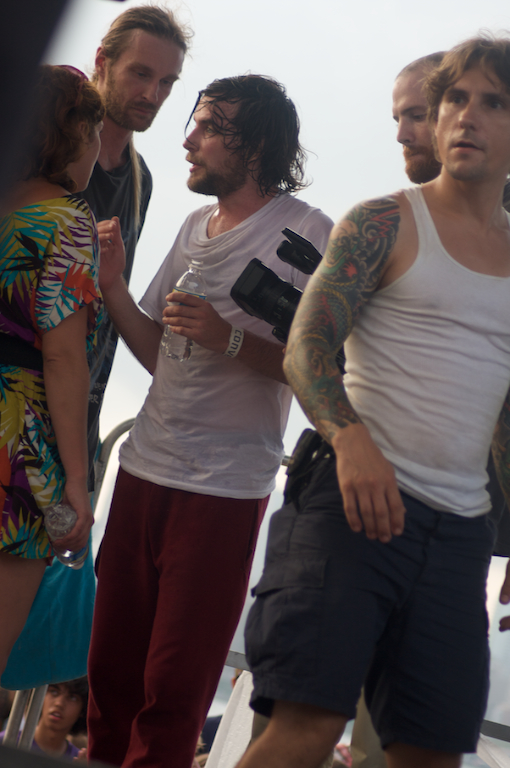 Then it was time for Gregg Gillis, playing to a park that stopped admitting people an hour before his set and saw its massive lines for admission splinter into ill-advised attempts to scale the perimeter fences (which ended in at least three arrests, from what I saw). There was a line of state patrolmen keeping people from rushing Gillis's table head on, but still plenty of people onstage dancing. The music stopped twice: the first time Gregg fixed it quickly and also revealed the inner workings of the Girl Talk laptop software magic ("Brooklyn can I get real with y'all? My backstage pass hit the space bar and the music stopped."), the next was because the dancing nearly broke the stage. It was fixed, then it started raining, just enough to convince the Jefferey Dahmer via Bedford Ave looking bro to my left to mercilessly strip off his tank top and anchor a big pocket of not-so-dry-humping danceheads. Perrrrfect. We had photographer Graeme Flegenheimer there to show you a bit of what I'm talking about.