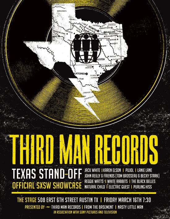 As we await the April release of Jack White's first solo LP Blunderbuss, we've already seen Jack put himself out there on SNL. Along those lines, Third Man Records announced today that it will host a SXSW showcase featuring White, ex-wife Karen Elson, John C. Reilly And Friends, The Black Belles, PUJOL White Rabbits, Lanie Lane and more which will occur Friday night at The Stage On 6th. That's the flyer up top. The only bad news: no rolling truck studio/stage this year. Or, no scheduled ICP appearance. But, I would not be surprised; the Juggalos will be in Austin.