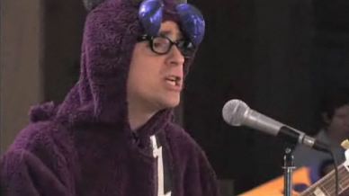 Head to EW.com for a clip of Rivers dressed as a purple spider as the band does "All My Friends Are Insects," an original for the Yo Gabba Gabba! kids show.