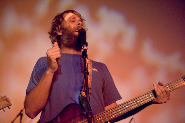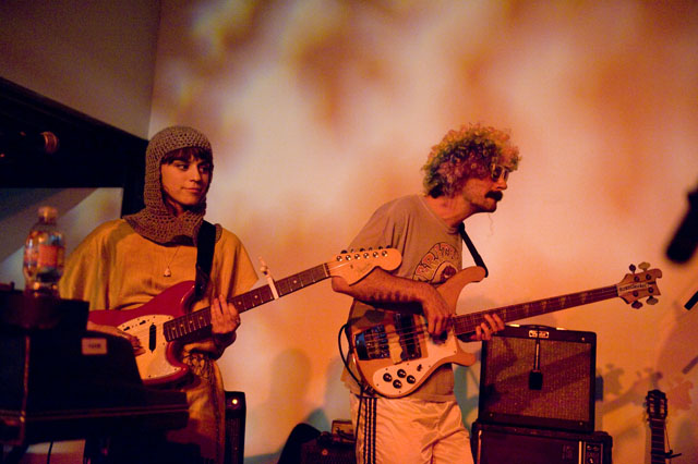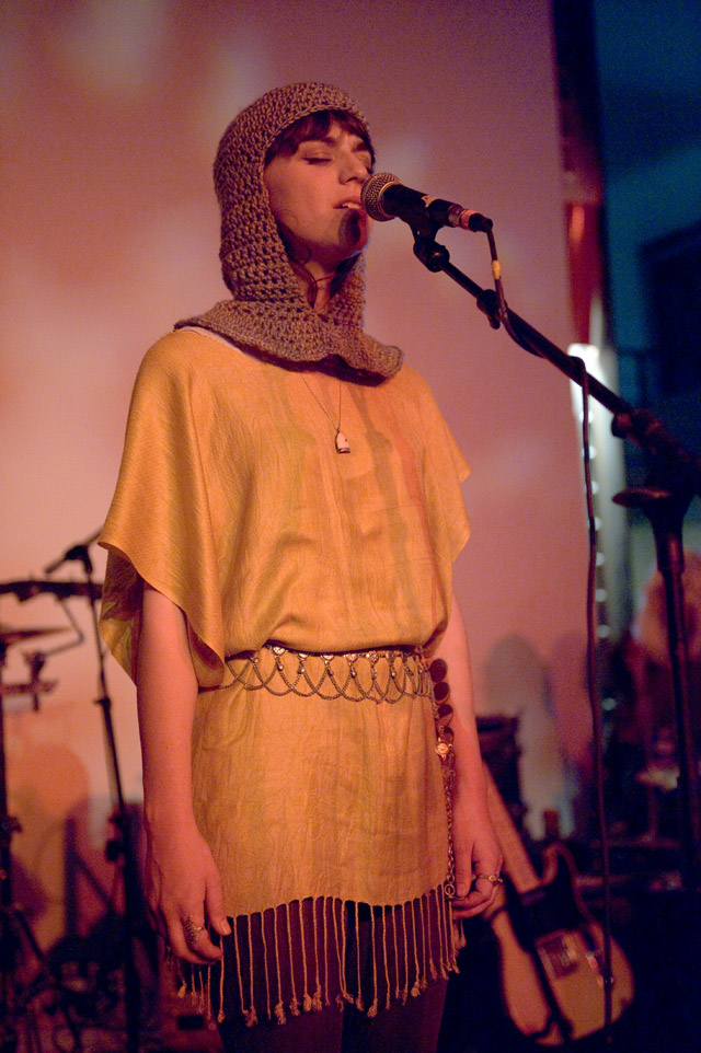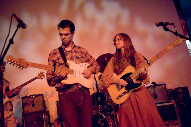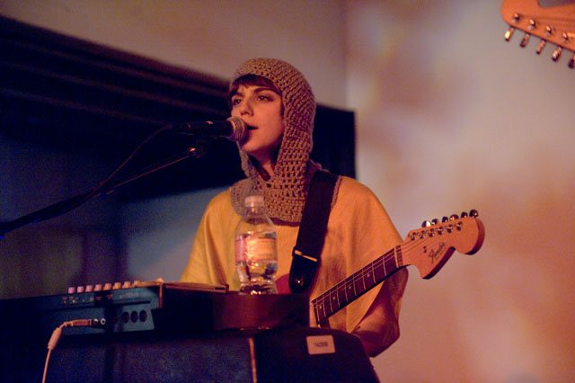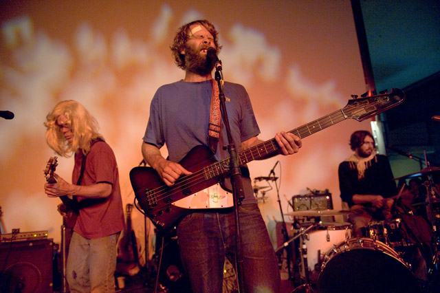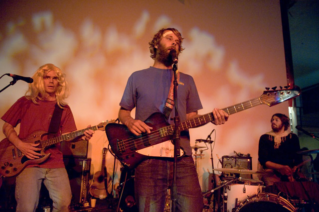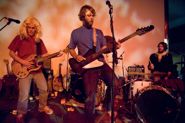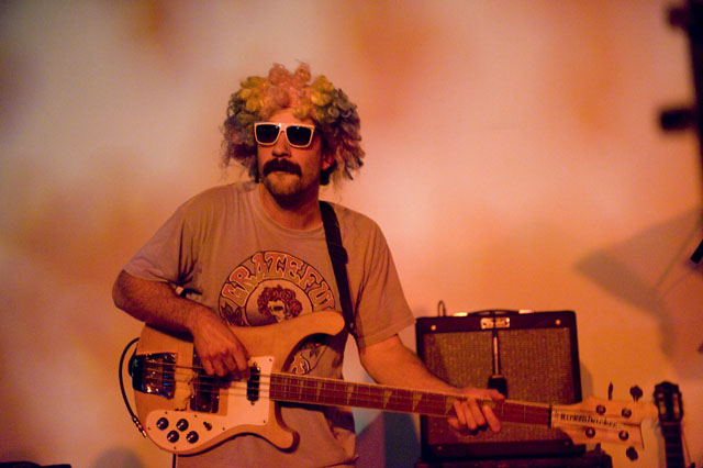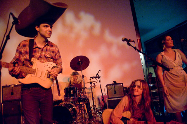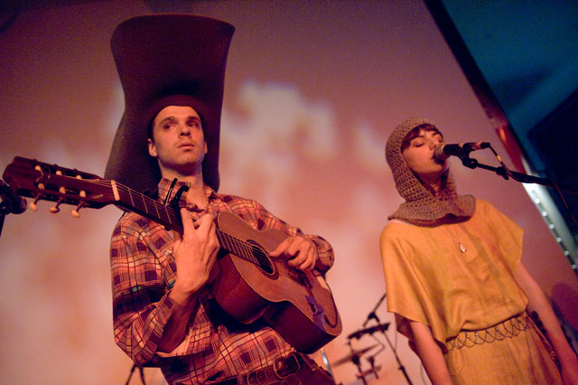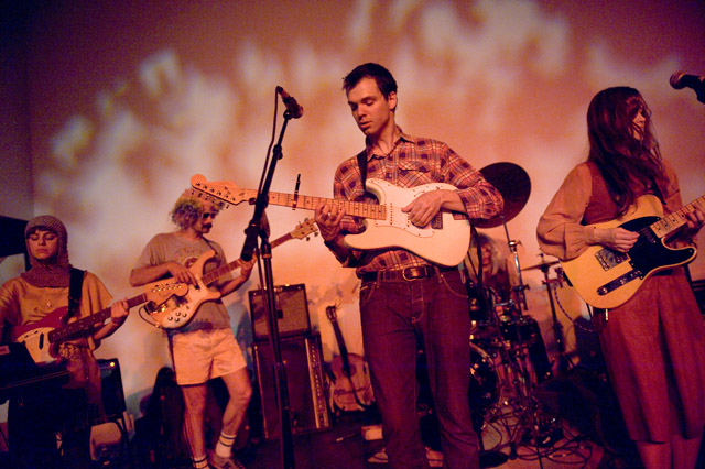 While you were out drinking as vampire Sarah Palins and slutty John McCains (research for this post conducted in 2008), musicians were celebrating Halloween in myriad ways their own: Phish covered Exile In Main Street in Indio; Titus Andronicus did an all-Weezer set while fending off security at the Vice 15 party in Williamsburg; Monsters Of Folk morphed into KISS; Pearl Jam dressed as Devo and covered "Whip It"; and doubtlessly countless more. Brooklyn's Dirty Projectors celebrated pumpkin day in Los Angeles with some silly headgear -- Longstreth in 10 gallon hat, Nat Baldwin in bozo wig, Angel in some cloth chainmail type thing -- but the DPs costume honors go to Amber Coffman who showed them up in Stevie Nicks regalia. The band played the Jensen RecCenter with openers Little Wings, and just today announced a return to Los Angeles to co-headline the Walt Disney Concert Hall with the Los Angeles Philharmonic, who will play selections chosen by Dave before the DPs do a set of their own. That isn't until February 27th (although tix are on sale 11/14/09); until then, have a pass through Andrew Youssef's shots.
