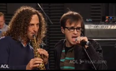 These days with Weezer it's all about the =w=TF, particularly when it comes to collaborations: yesterday we learned Rivers was doing a song with Adam Lambert while watched him pull Blair Waldorf on stage on Halloween at Hammerstein for "If You're Wondering If I Want You To (I Want You To)." As previously reported, the band's Spinner session ushers in a whole new round of fun, first and foremost via the soprano sax of Kenny G. Who knows if Kenny G or even Weezer is in on the joke at this point, but the performance itself, and watching The G walk out with his curls and start laying out the offensively inoffensive sax licks over "I'm Your Daddy," is a guaranteed smile -- particularly when he and Rivers lock eyes and grin on "this ain't improbable," which seems to have become a credo for latter day Weezer. Also, Rivers and Kenny are ageless just like Keanu. Anyway there are two more for you, too: Instead of Leighton Meester on "If You're Wondering" this Spinner set brings Sara Bareilles, and it actually came out great (because Sarah actually can sing), along with Chamillionaire replacing Weezy on "I Can't Stop Partying," laying down a de novo verse which doesn't focus on the Weezer/Weezy wordplay similarity because Chamillionaire is a smart rapper, that's how he's made chamillions of dollars.