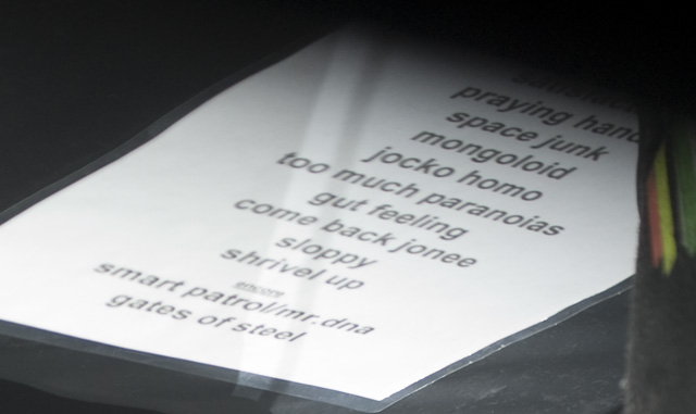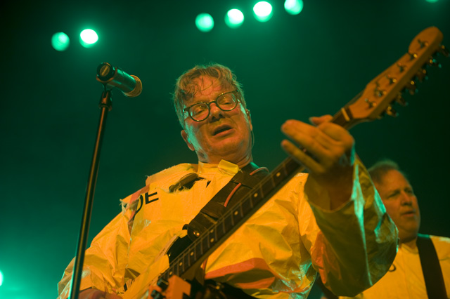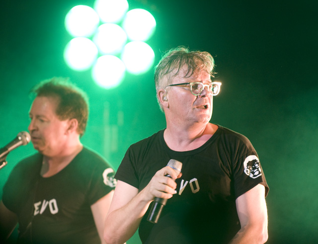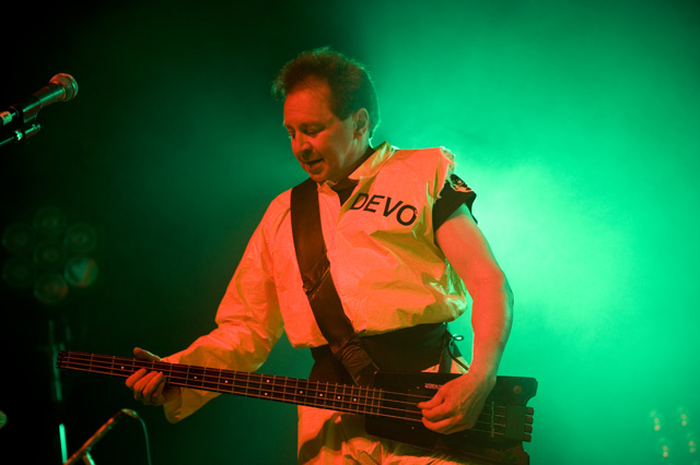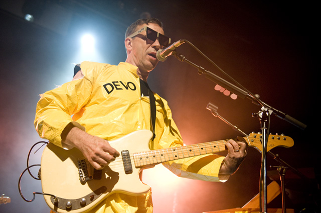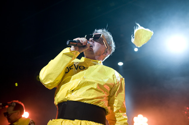 After kicking things off with the "Secret Agent Man" video, the men of DEVO launched into their debut LP Q: Are We Not Men? A: We Are Devo!, 3-D glasses in place. They didn't stop until the album was done -- tonight it's Freedom Of Choice, as both LPs are getting a re-release -- over a short but incredibly energetic set that drew the likes of Zack De La Rocha and Tony Kanal, cited by photographer Andrew Youssef as a testament to the new wave icons' far-reaching influence. Opening the night was the soulful singing and human beatboxing, performance artist/socially satirical stand-up mindbender Reggie Watts (you're welcome to describe him in less clauses), a suitable fit for a crowd with a bent toward unclassifiably whimsical artists.