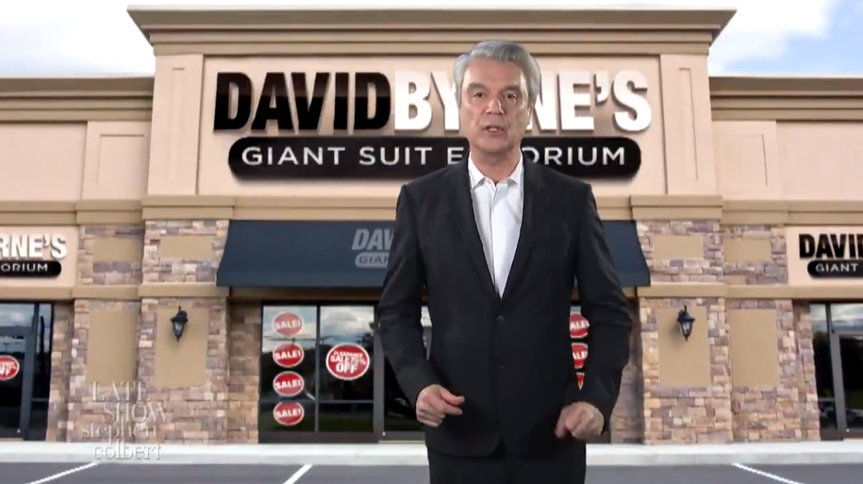 Watch David Byrne’s Giant Suit Emporium Commercial And Performance With Stephen Colbert