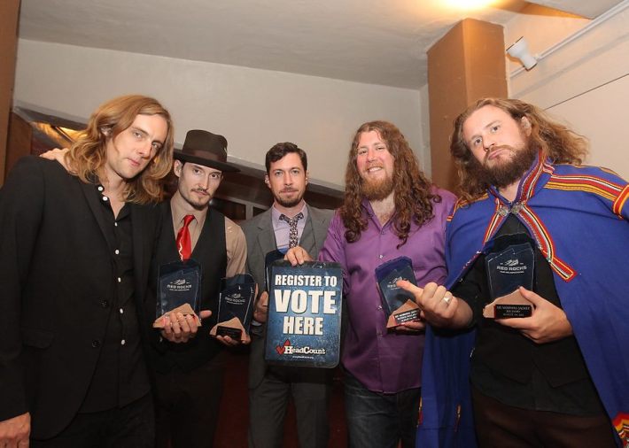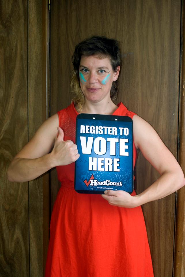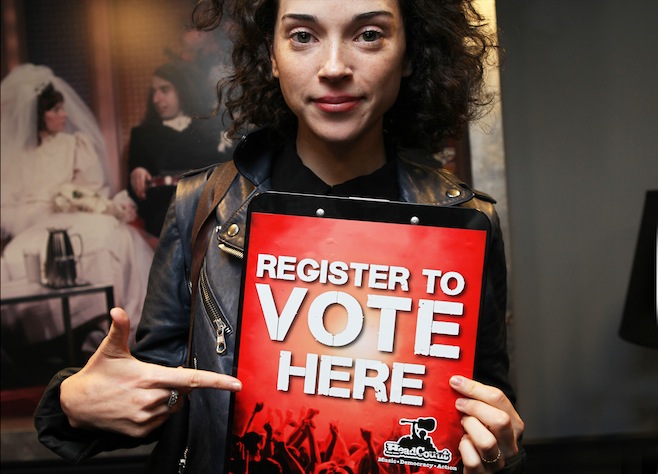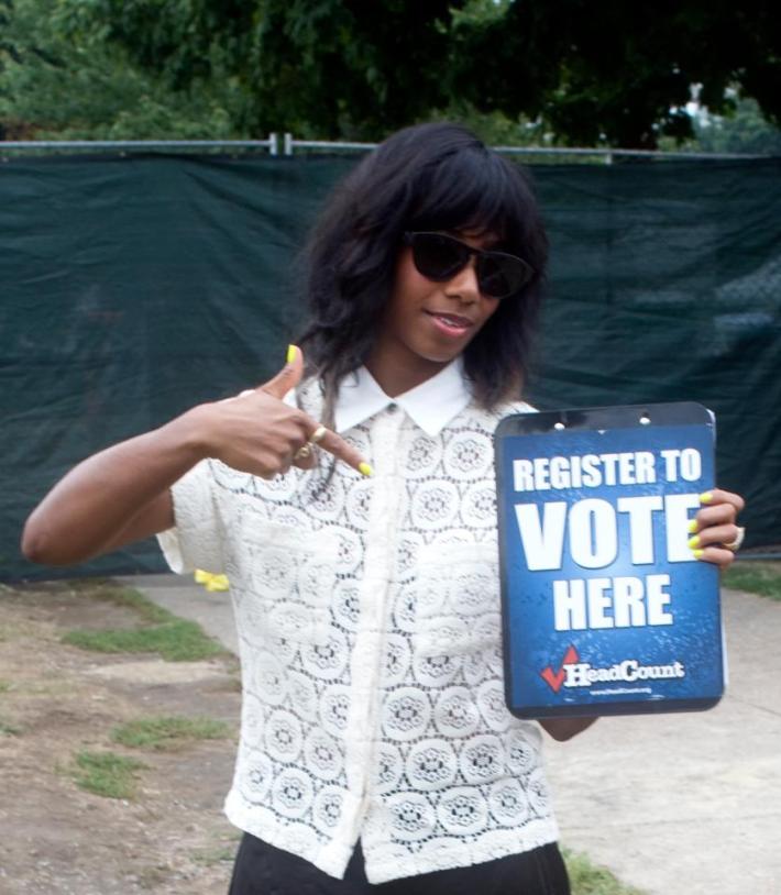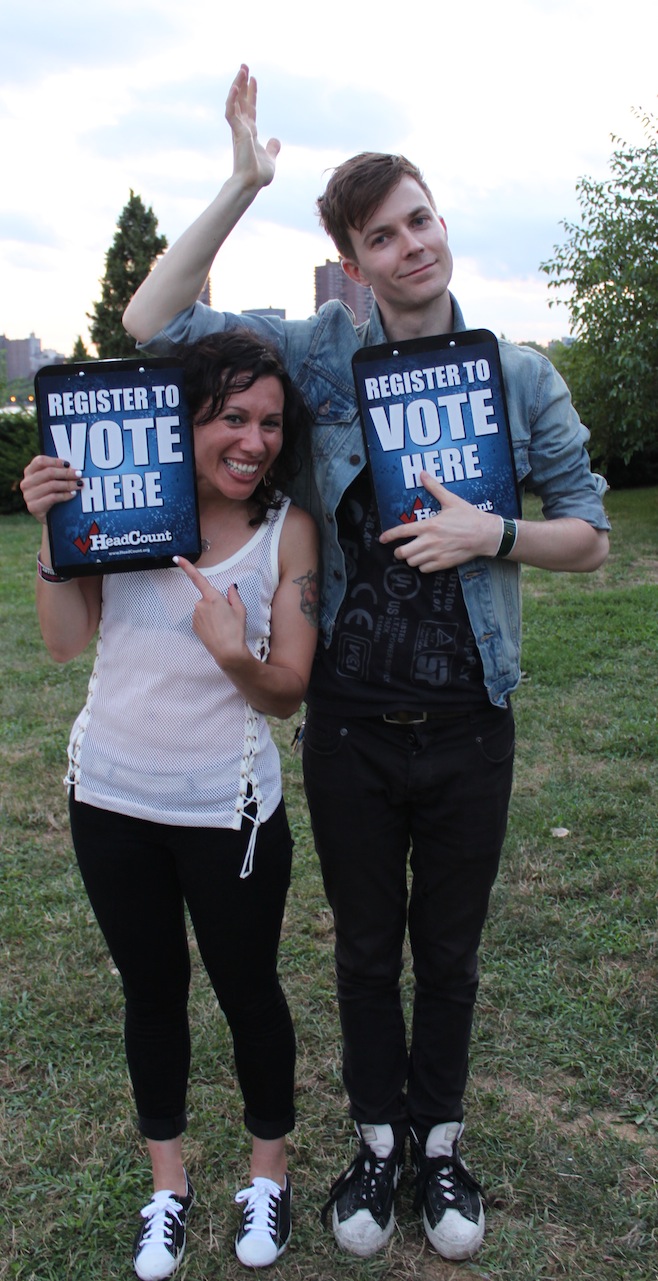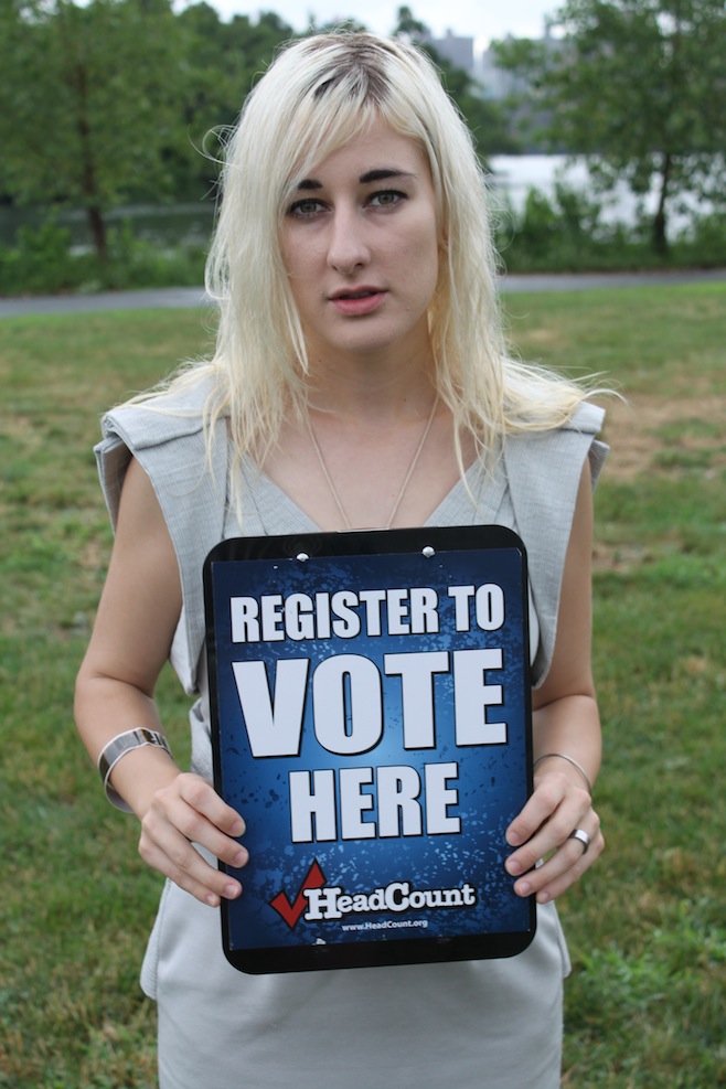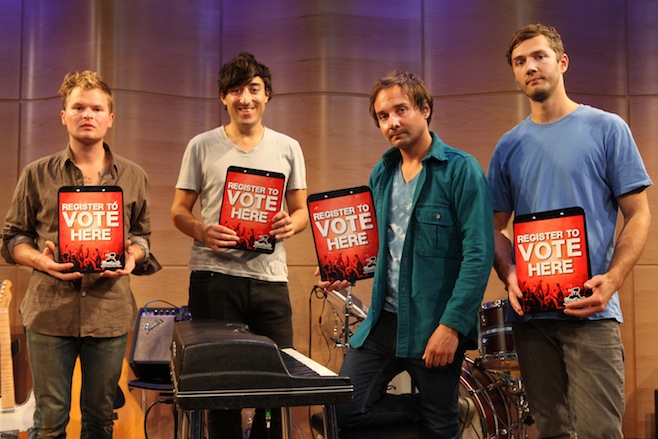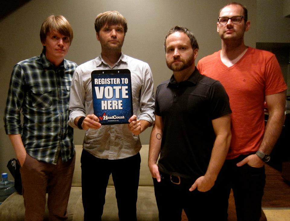 Tomorrow is National Voter Registration Day, and the non-partisan group HeadCount is taking action by hosting registration events in 30 cities. Alongside that push comes a social campaign featuring photos of indie rock luminaries like Grizzly Bear, TV On The Radio, St. Vincent and Death Cab For Cutie encouraging you to register. HeadCount has more photos -- a set which also features folks like Stephen Colbert as well as lots of dudes in jam bands -- from the campaign at their Facebook page. Hit the gallery to see some examples.