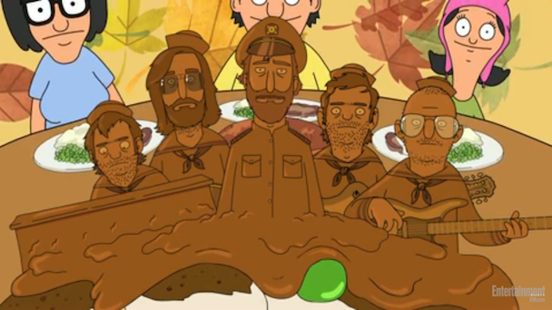 One of the greatest parts of Bob's Burgers, much like The Simpsons, is its songs. Last year we got an awesome Thanksgiving song about love, being thankful, and killing turkeys which was adapted into a dour ballad by the National, and now we've gotten something similar. This week's Thanksgiving special featured a typically surreal and hilarious song about gravy boats (with some help from Aunt Gayle, played by Megan Mullally) and now the National have expanded it into a full song. This is becoming a standard practice for Bob's Burgers which has done similar collaborations with Stephin Merrit and St. Vincent. You can watch the animated video for the National's "Sailors In Your Mouth" at Entertainment Weekly, and revisit last year's tune below.