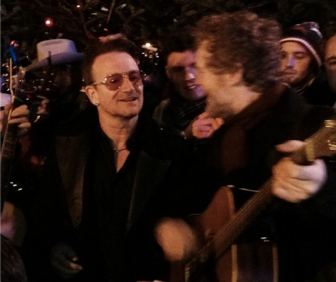 Bono and Glen Hansard surprised shoppers on Grafton St in Dublin tonight, singing Christmas songs to raise money for homelessness. This is the fifth year in a row Bono has busked for charity on Christmas Eve. Watch the U2 frontman sing Slade's "Merry Xmas Everybody" and "Oh Come All Ye Faithful" below.