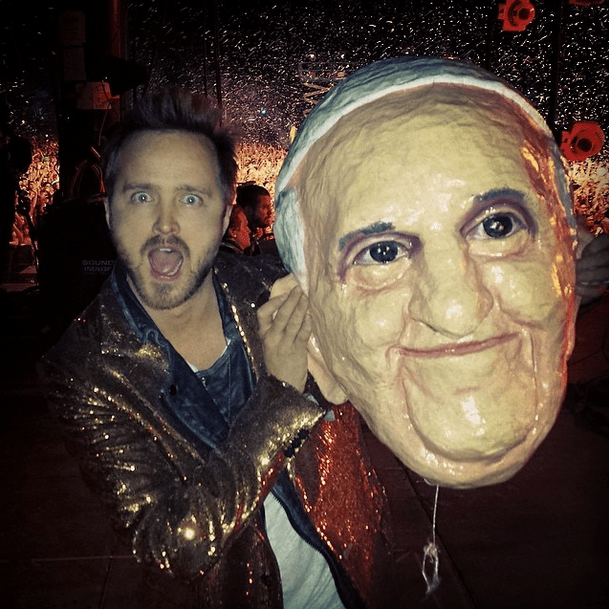Last week we heard about Aaron Paul's quest to get paid by some corporate sponsor for attending Coachella just like Lea Michele and Vanessa Hudgens. Looks like Paul, who is a huge festival fan and met his wife at a past Coachella, ended up at last weekend's festivities after all. As CoS points out, Scott Rodger of Quest Management posted a couple photos of Paul from Indio, including one where he's holding Arcade Fire's pope bobblehead (visible above). Apparently, Paul was the one under that mask during Arcade Fire's fantastic headlining set. Paul also posted this photo of he and his wife with Ellie Goulding to his own account: