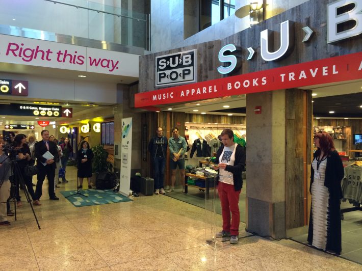 After ceremonially cutting the ribbon, Sub Pop founder Jonathan Poneman said that the SeaTac store idea was a long time coming facilitated by the Seattle Music Commission and its initiative to integrate local music into public areas. The Music Commission was also responsible for the PSAs by Gibbard, Jones and about 40 more Seattle musicians, plus the stream of 400-some songs by the same. Poneman's favorite item in the store? A T-shirt emblazoned with a map of the US that has a "disproportionately huge" Washington state outlined. "That kind of says it all," he said.