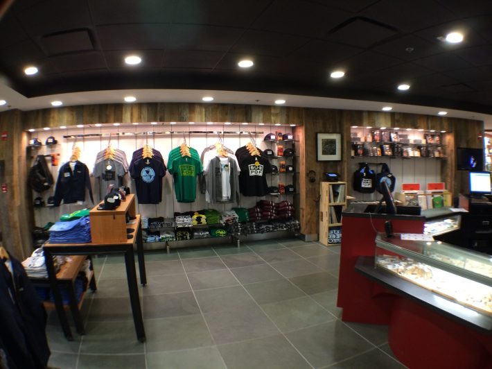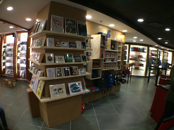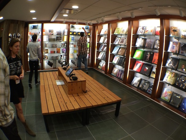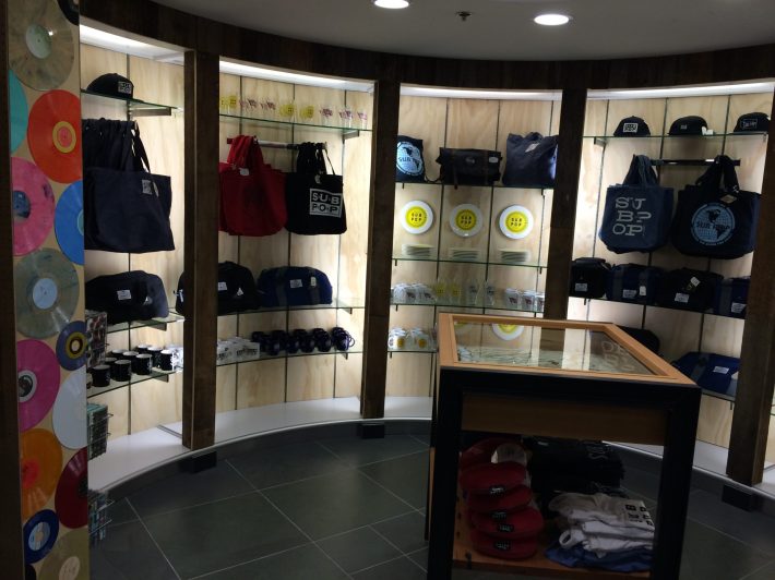 The 1,768-square-foot shop occupies the space vacated by Borders Books (ironic?). The front portion is a neatly displayed explosion of wildly diverse Sub Pop-branded merch: standard T-shirts, hoodies and hats plus never-seen-before, upscale travel-oriented items like Sub Pop neck pillows, Sub Pop flasks, Sub Pop canvas luggage, Sub Pop lap blankets…
