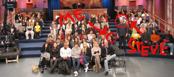 While waiting, someone I ASSUMED was an employee of the show came around with a large birthday card for Steve, asking everyone to sign it. We signed it and later (much later) were herded into the studio. But: OH NO! While walking into the studio we got wind of a problem -- too many people and not enough seats! Another very full bus (from Philadelphia) had come in while we were waiting and were seated ahead of the New York group. Will we have to wait in the waiting room for the next two hours? Would that be better or worse than actually seeing the taping? IS THERE A BAR NEARBY?! "Luckily" the staff made the decision to just add extra chairs, making for a very cramped second taping. So, just to clarify, it was like the first taping, but worse. We are seated in the very last row, in the corner. Max is seated next to Lauren and her t-shirt. "You owe me," he says, as if I didn't already know that.
