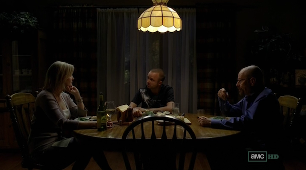 Skyler comes home, interrupting their discussion and Walt, to screw both of them over, invites Jesse to stay for dinner. It is a very awkward dinner.