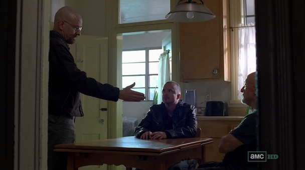 Walk, like an idiot, joins Saul and Jesse to talk about getting a new meth business up and running. Saul warns him that he just won the "Irish lottery" but, you know, being NOT DEAD FROM THE METH BUSINESS YET, and that he should chill out and probably not sell meth anymore. Walt tells him that he's "forty grand in the hole," and that that is not a reasonable place to stop. Which is such bologna. 40 grand? PRETTY MUCH EVERYONE HERE IS AT LEAST 40 GRAND IN THE HOLE. Kind of. Basically! He says some stupid stuff about scooping up the gold in the streets and then pressures Jesse into finding methylamine, which Jesse says is impossible. Ugh, Walt. He tells Saul to find a place in town where they can cook, even though that is so much more dangerous, because he doesn't want to have to drive very far? Everything he says is stupid and I hate him.