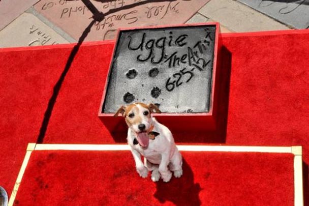AWWWWWWWWWW. But also WAIIIIIIIIIIIIIIT. No, nevermind. Don't wait. I'm ready. This makes sense. A dog putting its footprints in cement outside of a gaudy tourist trap because of a movie not that many people probably even saw actually? Yes. SHOWBUZZZZZZ! Congratulations to Uggie who has worked so hard all these years for some recognition. You earned it. You and Danny Devito. Anyways, capture this photo of American Royalty being honored in a way that is reasonable and appropriate.