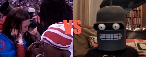 I know we all hate public marriage proposals. None of us have a different opinion on them, certainly none of us have ever done them or had them done to us, and sometimes we can't get to sleep at night because we can't stop thinking about how terrible they make us feel. I definitely know that all of that is the truth. And, I have to tell you, the first proposal you're going to see is kind of a public marriage proposal, because it is Greg Jones -- sportsman -- proposing to his girlfriend after winning the Super Bowl. But it is public in the quietest way possible, while still being surrounded by a million cameras and people. And it still sounds PRETTY GOOD, right? I cannot wait until my future husband wins the Super Bowl and then proposes to me and the stays faithful to me for the rest of my life. The second video is kind of like an intense opposite of a public marriage proposal, while still being something that you're watching on the internet. (A man in a Bender helmet proposing in binary code.) So we're all agreeing that they're both pretty cool marriage proposals, but -- WHICH IS THE COOLEST? Please watch and judge for yourself.