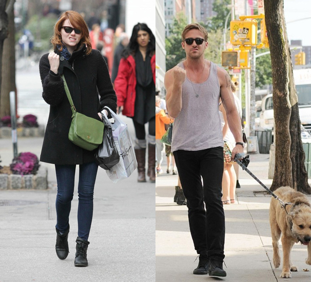 Last night, I did a show with my good friends Max Silvestri and Gabe Liedman in which we debated the merits of New Hollywood vs. Old Hollywood against another team of performers made up of Dave Hill, Julie Klausner, and Rachel Shukert, moderated by comedian Jessi Klein. It was a fun event! You should have been there! Where were you?! But anyway, after Max's very important slideshowcomparing New Hollywood's beautiful tight bodies to Old Hollywood's disgusting trash bags (like I said, you really should have been there), which naturally featured an image of America's Husband, Ryan Gosling, Jessi Klein made the point that Ryan Gosling has done more for gay marriage this past year than anyone because even heterosexual guys would def want 2 marry him. That is a good joke, Jessi Klein, because of how it is BASED IN TRUTH. Anyway, look, 2011 was obviously basically 2000RyanGosling, but here we are in 2012 and I'm not sure this thing is going anywhere. Look at us! A stupid paparazzi photo of Emma Stone making the same face that Ryan Gosling made in a stupid paparazzi photo of Ryan Gosling? UH YEAH, IT'S CALLED BREAKING NEWS AND THAT'S WHY WE ARE REAL JOURNALISTS. #Journalism #PaleyCenterForGoslingStudies (Via Pajiba. Click through to enlarge.)