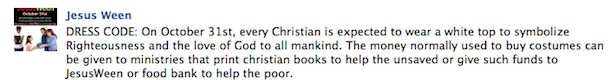 I was going to go into talking about how I always have such a hard time trying to figure out what to be for JesusWeen, like I always have ideas throughout the year but never really remember them or act on them and when JesusWeen actually comes I just end up throwing on whatever and everyone's always super upset like it's any of their business anyway, but then I was looking at JesusWeen's Facebook page and saw this: