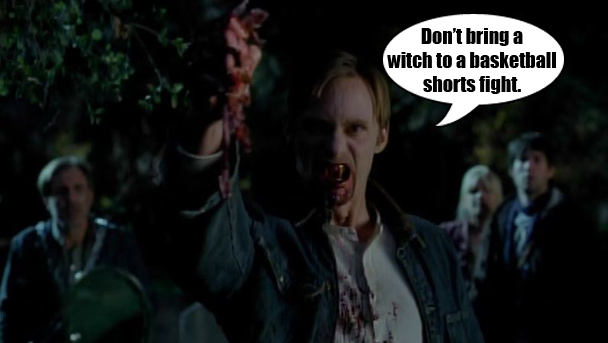 Alcide and his girlfriend have joined a new werewolf pack (oh brother, are there really people who like this show and aren't embarrassed to talk about it? Because it's embarrassing to talk about!) and the new pack leader has instructed everyone to stay out of the fight between the vampires and the witches. Haha. Sure. No problem, chief. One "pup," which is what the adult werewolves call the teenage werewolves, talks a big game about the vampires and later gets into a fight at the barbecue. Oh, pups. When will they learn?! Aclide's girlfriend tells him that this means he can't be friends with Sookie anymore because the werewolves aren't supposed to get mixed up with the vampire vs. witches and Sookie is Team Edward. Alcide promises that she has nothing to worry about. I bet that's a solid promise. I bet that is just a rock solid promise.