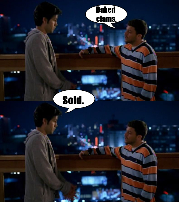 Turtle is having lunch with Mr. Tequila, who gives him a gold watch as a sign of his appreciation. "You know, in the US they usually give someone a gold watch when they're retirin'," Turtle says. Hahha. This makes sense for him to say because Turtle is a well-known scholar of American Workplace Traditions and Customs. Mr. Tequila explains that Turtle is OUT because of Mark Cuban? I don't know how business works. He also explains that Turtle's girlfriend is not his girlfriend anymore. Damn. You guys, if Mr. Tequila ever invites you to lunch, don't go! He is only going to give you as much bad news as possible. (Although he will also give you a gold watch. Nevermind, go to lunch. You have to eat!) Now Turtle is sad because he wants his own business. That is true. If there is one thing we have learned about Turtle over the years it is that he drives the Hummer wears all the basketball jerseys has comical difficulty getting pussy in his eternal pussy war with Drama wants to run his own business. Vince asks him if he has any ideas for a business and he says that he does. He wants to open a baked clams restaurant in Los Angeles. HAHAHAHAHAHHAHAHAHH. Uhhhhhhh. Look, maybe a baked clams restaurant would do great out there. That's not the point. But Turtle has already tried to be a rap producer, a limo service operator, and a tequila distributor, all of which sound much more reasonable and foolproof than BAKED CLAMS RESTAURANT ENTREPRENEUR. Vince tells him it's a great idea. Oh, well then I'm sure it is. They decide they will both cash out their Tequila Stock (TQS on the Dow) and put all the money into baked clams. This is definitely going to work out great.