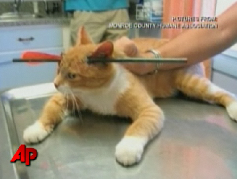 Look, the Internet is basically the caternet. We know that. In the future, there won't be an infinite number of websites appealing to every niche of the human world. There will just be one website. And it will be a top 10 list of cute cats. Some of them wearing casts on their broken paws. But how is it that every cat on the internet is cute? Surely there have to be some cats that are not cute, but none of them are on the Internet. (They're probably in some catfugee camp somewhere, hiding.) Like look at this little guy. He has a 13-INCH ARROW STICKING OUT OF HIS HEAD. And yet, when you hear the reporter tell his harrowing story, all it sounds like is "awww awww awww, cute cute awww."