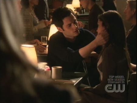 Now, look, I'm not a lawyer, or even a particularly high-functioning adult, but if I had just been accused of having inappropriate relations with one of my students, I would not MEET THAT STUDENT ALONE AT A RESTAURANT THAT SAME NIGHT AFTER SCHOOL. Ms. Carr shouldn't be fired for having sex with Dan. She should be fired for being a FUCKING IDIOT. She explains over coffee that she would never in a million years have sex with Dan, and he TAKES OFFENSE? Yuck. But even worse is that she then explains that no, no, she would never in a million years because of how she is a teacher and he is a student, not because of Dan not being super fuckable and that she would like to fuck him all the time, and that he should call her in five years and they will fuck so hard. Jesus Christ. Oh, also, surprise, Serena shows up with the dayplanner, because Ms. Carr PENCILED IN HER MEETING WITH DAN INTO HER DAYPLANNER, JUST TO BE SURE SHE DIDN'T MISS THE IMPORTANT LATE NIGHT MEETING WITH THE STUDENT SHE'D JUST BEEN ACCUSED OF RAPING, SO MANY MEETINGS AND THINGS TO JUGGLE IT'S HARD TO KEEP THEM STRAIGHT. Serena sees Dan gently brushing Ms. Carr's hair behind her ear with his soft, writerly fingers, and she takes a cell phone picture. If only that was one of those new Motorola Gun Phones. It has a 10 megabullet gun built right in.